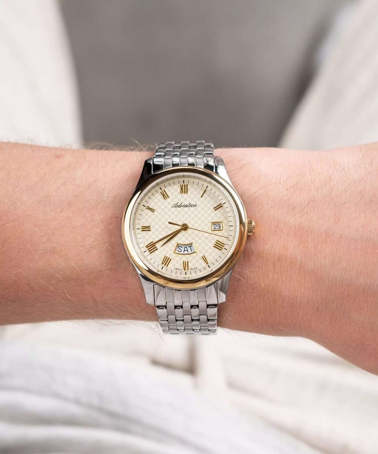 Часы Adriatica A1025.2161Q представляют собой идеальное сочетание элегантности и функциональности, разработанное для современных мужчин. Их стильный циферблат защищен сапфировым стекломСапфировое стеклоПрочный и надёжный материал из кристалла сапфира синтетического происхождения, характеризующийся особой твёрдостью и устойчивостью к царапинам и повреждениям., что придает дополнительную устойчивость к царапинам. Корпус из нержавеющей стали подчеркивает их изысканность и долговечность. Надежный кварцевый механизм с калибром RONDA 517 гарантирует точность времени, а водозащита WR 50 (5 ATM) обеспечивает защиту от воды в различных условиях. Браслет из нержавеющей стали с раскладной застёжкойРаскладная застёжкаТакой тип застёжки используется только на браслетах из металла. Она никогда не раскрывается полностью, происходит разделение на 2 и более частей. Раскладывающая застёжка снизит вероятность потери часов к минимуму., гармонично дополняет общий дизайн и обеспечивает комфортное ношение на запястье. Окошко даты находится в положении 3 часа. День недели отображается в положении 6 часов. БезельБезельВнешний ободок, закрепляющий стекло. В спортивных часах так называется поворотное кольцо с делениями на циферблате, выполняет роль таймера – замеряет отрезки времени на шкале. Неподвижный безель – элемент декора. Однонаправленно вращающийся безель на дайверских часах позволяет фиксировать моменты погружения и выныривания на поверхность. с PVD-покрытиемPVDУльтратонкое покрытие наносится в технике вакуумного напыления, сочетает в себе нитрид титана особой прочности со слоем золота или оксида хрома. Несёт в себе декоративную или защитную функцию..