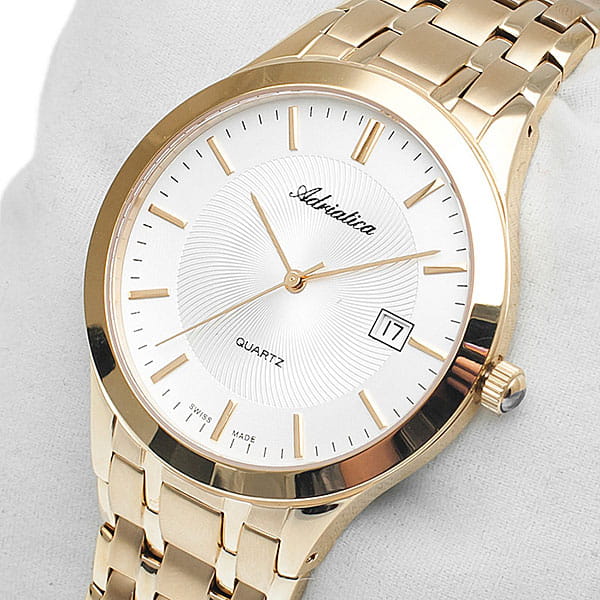 Швейцарские мужские наручные часы Adriatica Twin A1236.1113Q, кварцевый механизм с высокой точностью. Сапфировое стеклоСапфировое стеклоПрочный и надёжный материал из кристалла сапфира синтетического происхождения, характеризующийся особой твёрдостью и устойчивостью к царапинам и повреждениям. устойчивое к появлению царапин, обладающее высокой прозрачностью. Класс водозащиты: 50 метров, позволит защитить корпус от случайных брызг или капель дождя. Корпус часов изготовлен из стали с PVDPVDУльтратонкое покрытие наносится в технике вакуумного напыления, сочетает в себе нитрид титана особой прочности со слоем золота или оксида хрома. Несёт в себе декоративную или защитную функцию. покрытием. Часы оснащены оригинальным литым браслетом со съемными секциями, позволяющими регулировать длину. Браслет на раскладной застежке с фиксатором. Циферблат окрашен в белый цвет, центр которого украшен гильошированным рисунком в виде дуг, расходящихся от центра до длинных позолоченных маркеров часа.
