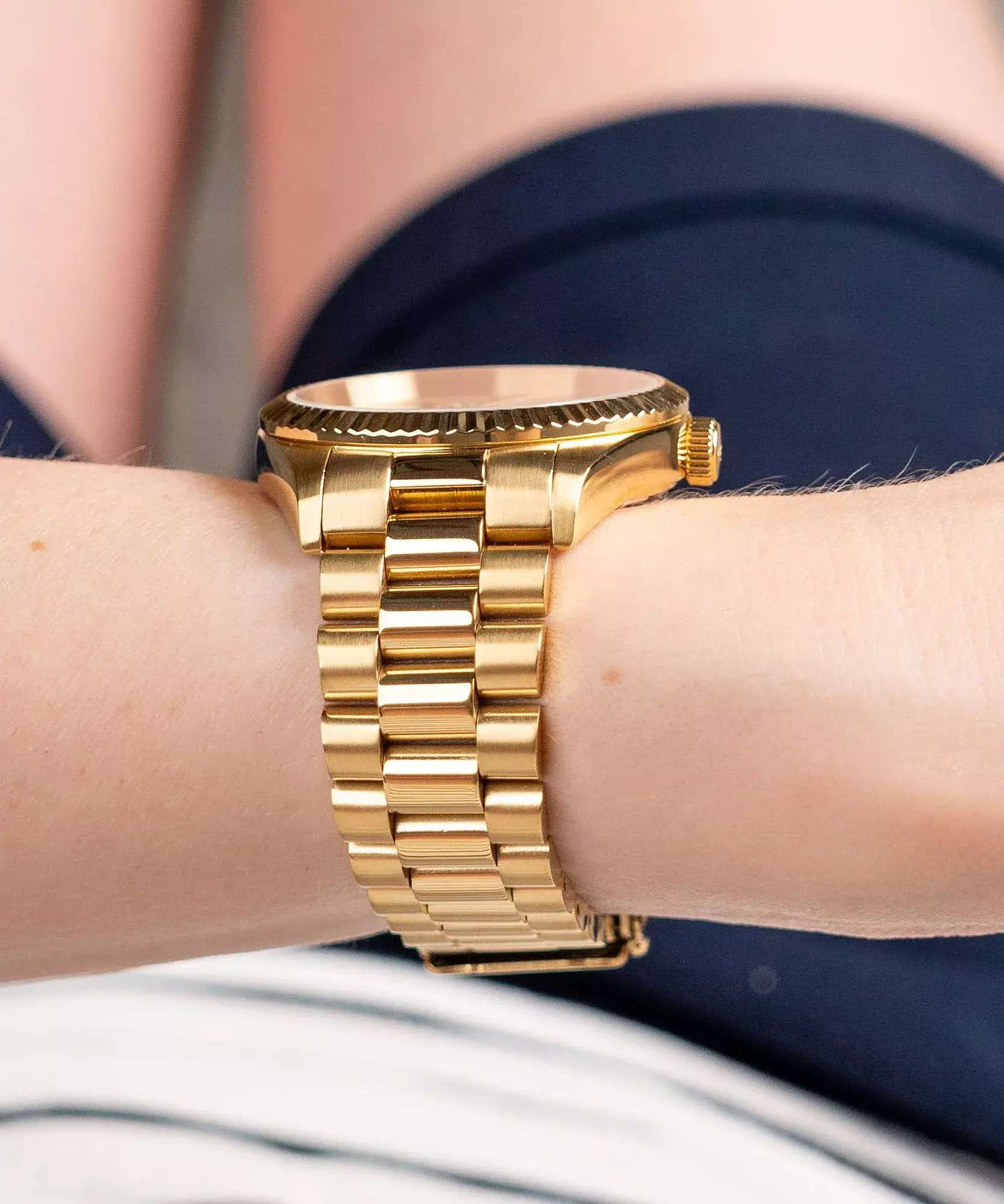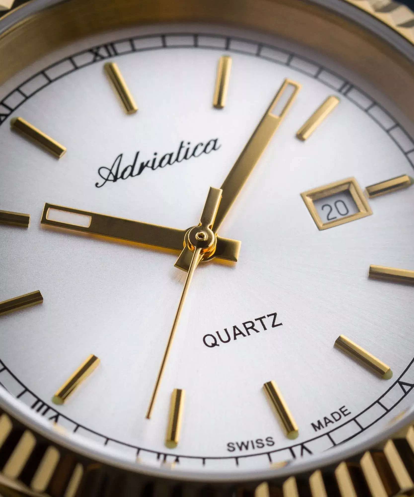 Женские кварцевые часы Adriatica A3090.1113QXL — изысканная швейцарская классика с тёплым золотым оттенком. Круглый корпус размером 36 мм из стали с PVD-покрытиемPVDУльтратонкое покрытие наносится в технике вакуумного напыления, сочетает в себе нитрид титана особой прочности со слоем золота или оксида хрома. Несёт в себе декоративную или защитную функцию. цвета жёлтого золота, циферблат с солнечной текстурой Sunray и штрихами, окошко даты в положении 3 часов. Стекло — минеральноеМинеральное стеклоМинеральное стекло представляет собой искусственно выращенный минерал кварца. Такое стекло отличается особой устойчивостью к повреждениям и царапинам. Уступает по некоторым качествам сапфировому стеклу. с сапфировым покрытиемСапфировое стеклоПрочный и надёжный материал из кристалла сапфира синтетического происхождения, характеризующийся особой твёрдостью и устойчивостью к царапинам и повреждениям.. Механизм — швейцарский кварцевый Ronda 785. Водонепроницаемость 50 м. Рифлёный безельБезельВнешний ободок, закрепляющий стекло. В спортивных часах так называется поворотное кольцо с делениями на циферблате, выполняет роль таймера – замеряет отрезки времени на шкале. Неподвижный безель – элемент декора. Однонаправленно вращающийся безель на дайверских часах позволяет фиксировать моменты погружения и выныривания на поверхность. и завинчивающаяся заводная головка подчёркивают внимание к деталям. Браслет — стальной с PVD-покрытиемPVDУльтратонкое покрытие наносится в технике вакуумного напыления, сочетает в себе нитрид титана особой прочности со слоем золота или оксида хрома. Несёт в себе декоративную или защитную функцию. на раскладной застёжкеРаскладная застёжкаТакой тип застёжки используется только на браслетах из металла. Она никогда не раскрывается полностью, происходит разделение на 2 и более частей. Раскладывающая застёжка снизит вероятность потери часов к минимуму.. Идеальный выбор для тех, кто ценит швейцарское качество и элегантный женственный стиль.