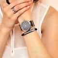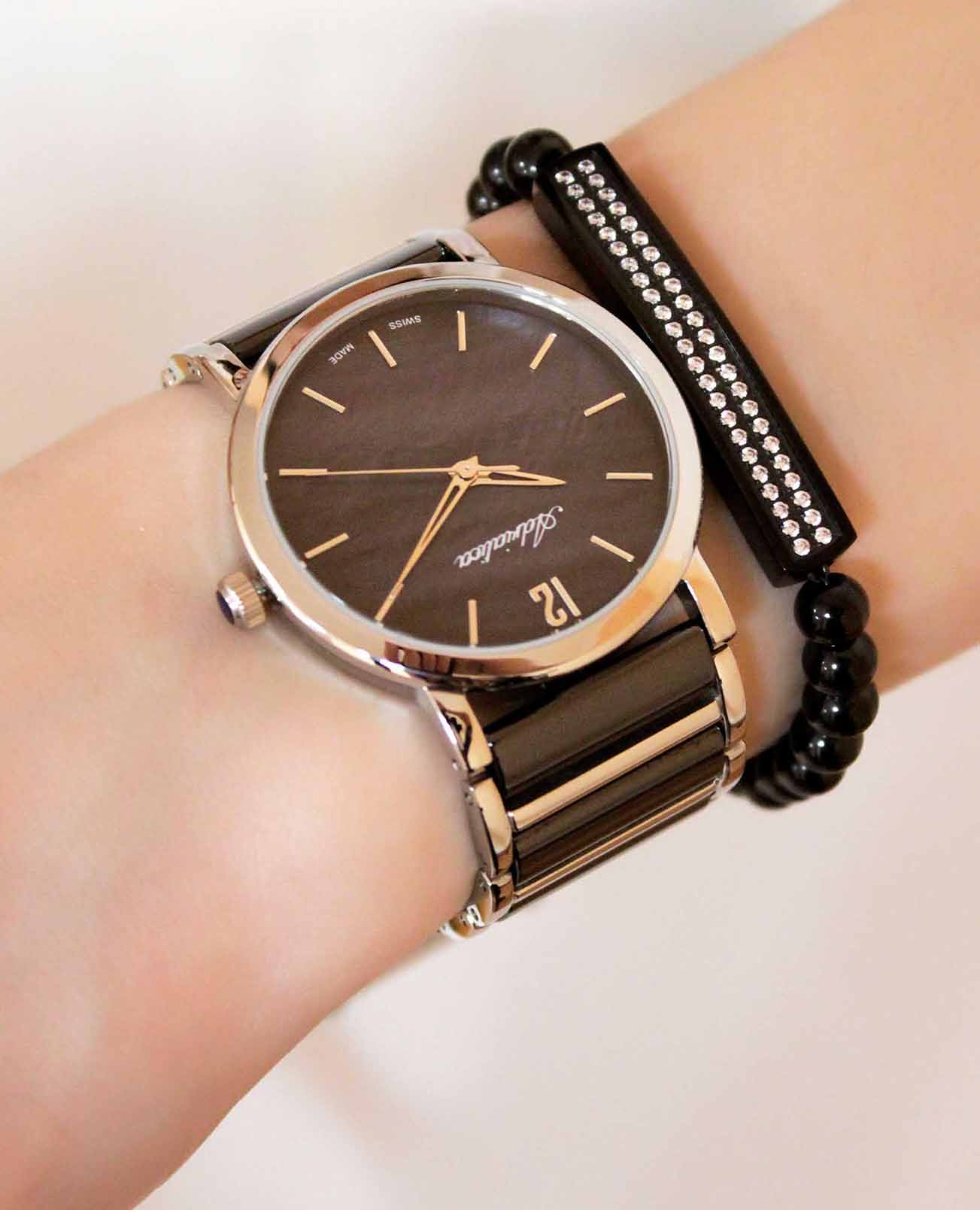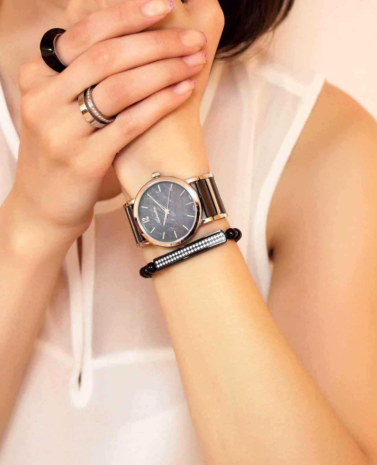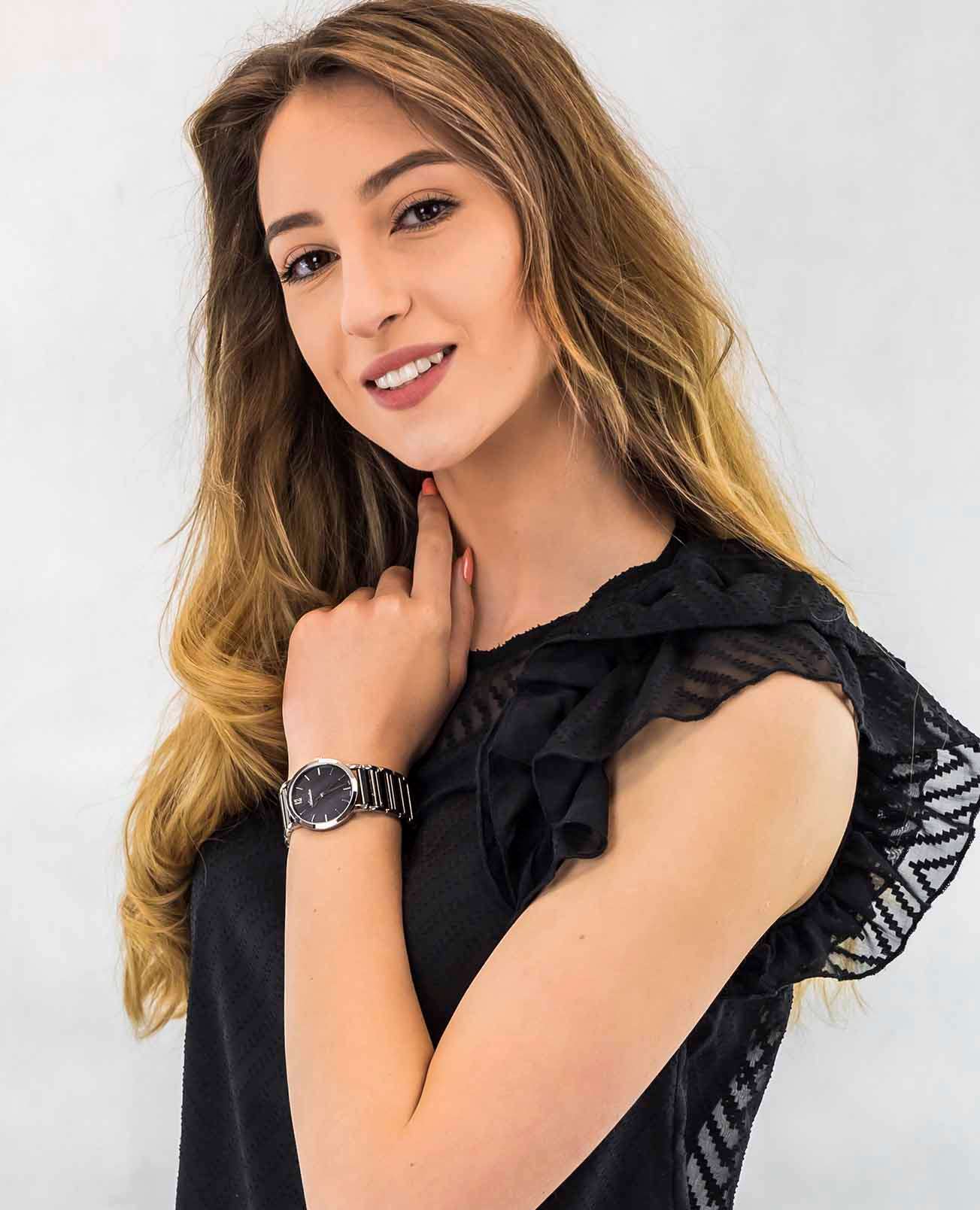 Часы Adriatica A3721.E15MQ воплощают в себе утонченную элегантность и надежность, идеально подходящие для современных женщин. Выполненные в Швейцарии, они оснащены высокоточным кварцевым механизмом с калибром RONDA 763, который обеспечивает безупречную точность хода. Корпус из нержавеющей стали диаметром 36 мм и толщиной 7 мм, что придаёт ему утончённый и современный вид. Черный перламутровый корпус защищает минеральное стеклоМинеральное стеклоМинеральное стекло представляет собой искусственно выращенный минерал кварца. Такое стекло отличается особой устойчивостью к повреждениям и царапинам. Уступает по некоторым качествам сапфировому стеклу., придающее часам изысканный вид, а водозащита 3 ATM гарантирует защиту от случайных брызг. Браслет из нержавеющей стали с черными биокерамическимиБиокерамикаБиокерамика — это материал, который на две трети состоит из керамики, на одну треть — из биопластика. Он сочетает в себе лучшие качества обоих материалов и обладает прочностью и шелковистой на ощупь текстурой. вставками, обеспечивает комфорт и долговечность, а ювелирная застежка добавляет дополнительный штрих к утонченности дизайна. Часы весят всего 80 грамм, что делает их практически невесомыми на запястье, обеспечивая комфорт в течение всего дня. Эти часы станут идеальным дополнением к любому образу, подчеркивая индивидуальный стиль и вкус их обладательницы.