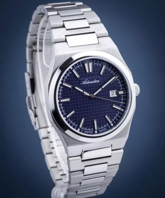 Часы Adriatica Premiere A8326.5115Q воплощают в себе элегантность и функциональность, идеально подходящие для современных мужчин, ценящих швейцарское качество. Их синий циферблат защищенный сапфировым стекломСапфировое стеклоПрочный и надёжный материал из кристалла сапфира синтетического происхождения, характеризующийся особой твёрдостью и устойчивостью к царапинам и повреждениям., заключен в корпус из нержавеющей стали диаметром 40 мм и толщиной 10 мм. Надежный кварцевый механизм с калибром ETA F06 обеспечивает высокую точность, а водозащита 5 ATM делает часы устойчивыми к воздействию воды. Стальной браслет с раскладной застёжкойРаскладная застёжкаТакой тип застёжки используется только на браслетах из металла. Она никогда не раскрывается полностью, происходит разделение на 2 и более частей. Раскладывающая застёжка снизит вероятность потери часов к минимуму. обеспечивает комфортное и надежное ношение. Часы оснащены функцией отображения даты в окошке в положении 3 часа, что добавляет практичности в повседневной жизни. Люминесцентное покрытиеЛюминесцентное покрытиеПозволяет считывать показания времени в темноте. Производители наносят на стрелки, часовые индексы, безель или поверхность циферблата светонакопительный состав, дающий холодное свечение. на стрелках и метках обеспечивает отличную видимость в темноте.
