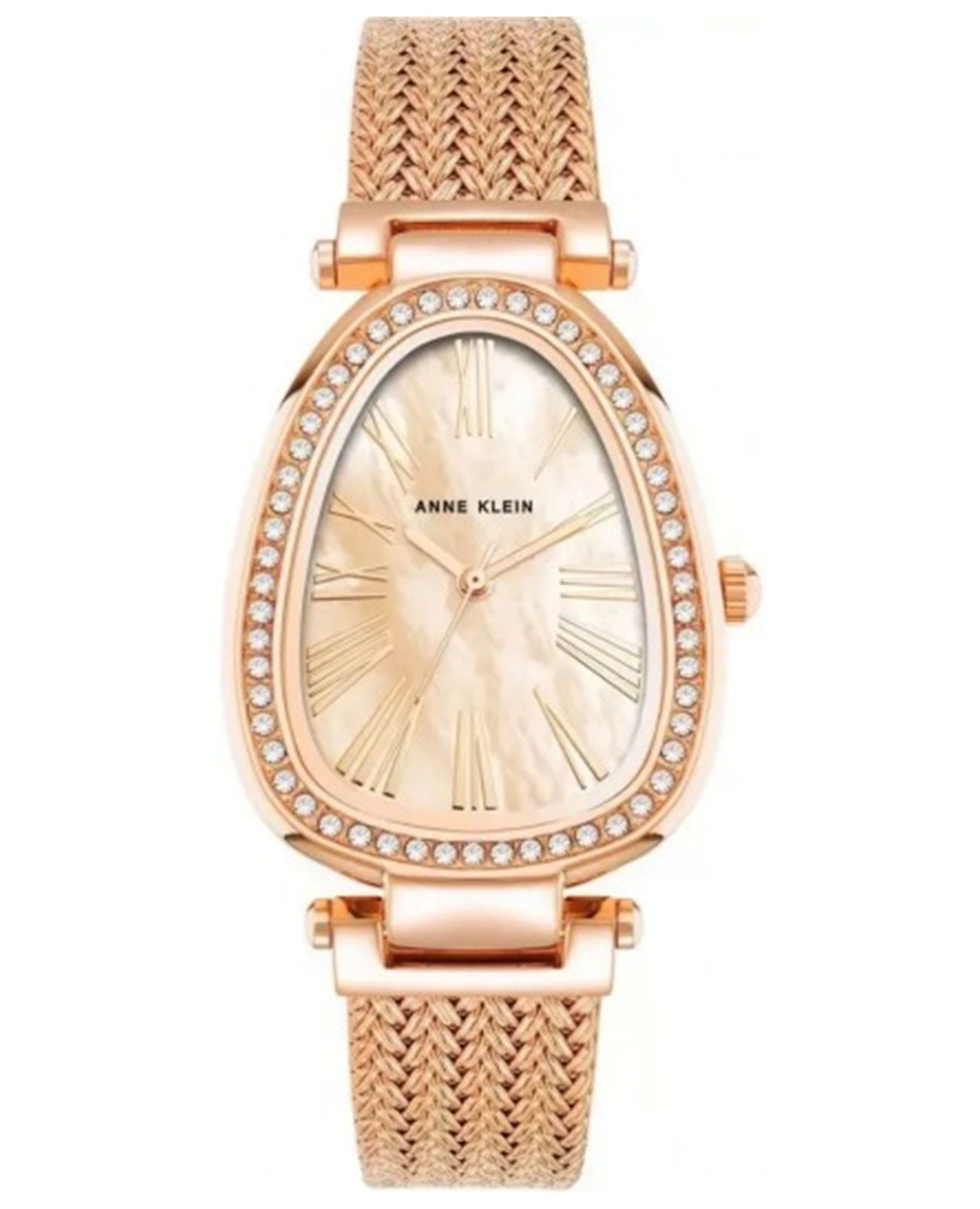 Женские кварцевые часы Anne Klein Crystal 5008PMRG представляют собой роскошный аксессуар с овальным корпусом 36 мм из латуни с PVDPVDУльтратонкое покрытие наносится в технике вакуумного напыления, сочетает в себе нитрид титана особой прочности со слоем золота или оксида хрома. Несёт в себе декоративную или защитную функцию.-покрытием в розово-золотистом оттенке. Модель украшена кристаллами , обрамляющими циферблат и корпус, создавая эффект сияющего ореола. Перламутровый циферблат розового оттенка с позолоченными стрелками и римскими цифрами дополнен кварцевым механизмом швейцарского производства с точностью хода ±15 секунд в месяц. Защитноеминеральное стеклоМинеральное стеклоМинеральное стекло представляет собой искусственно выращенный минерал кварца. Такое стекло отличается особой устойчивостью к повреждениям и царапинам. Уступает по некоторым качествам сапфировому стеклу. с антибликовым покрытием обеспечивает превосходную видимость и устойчивость к царапинам. Металлический браслет с PVDPVDУльтратонкое покрытие наносится в технике вакуумного напыления, сочетает в себе нитрид титана особой прочности со слоем золота или оксида хрома. Несёт в себе декоративную или защитную функцию.-покрытием украшен вставками из розового золота. Часы сочетают в себе ювелирную роскошь и часовое мастерство, что делает их идеальным выбором для особых случаев и вечерних выходов.