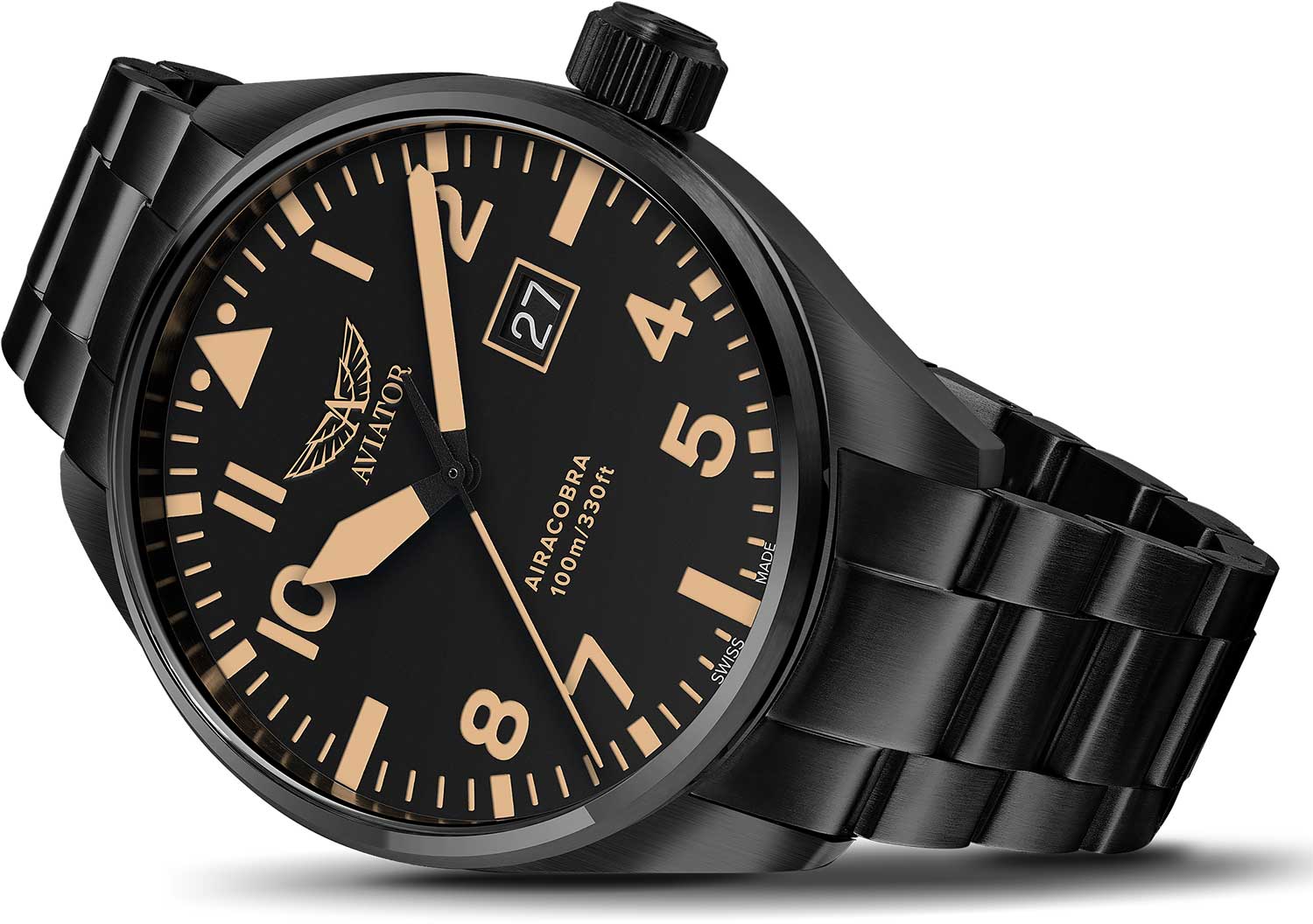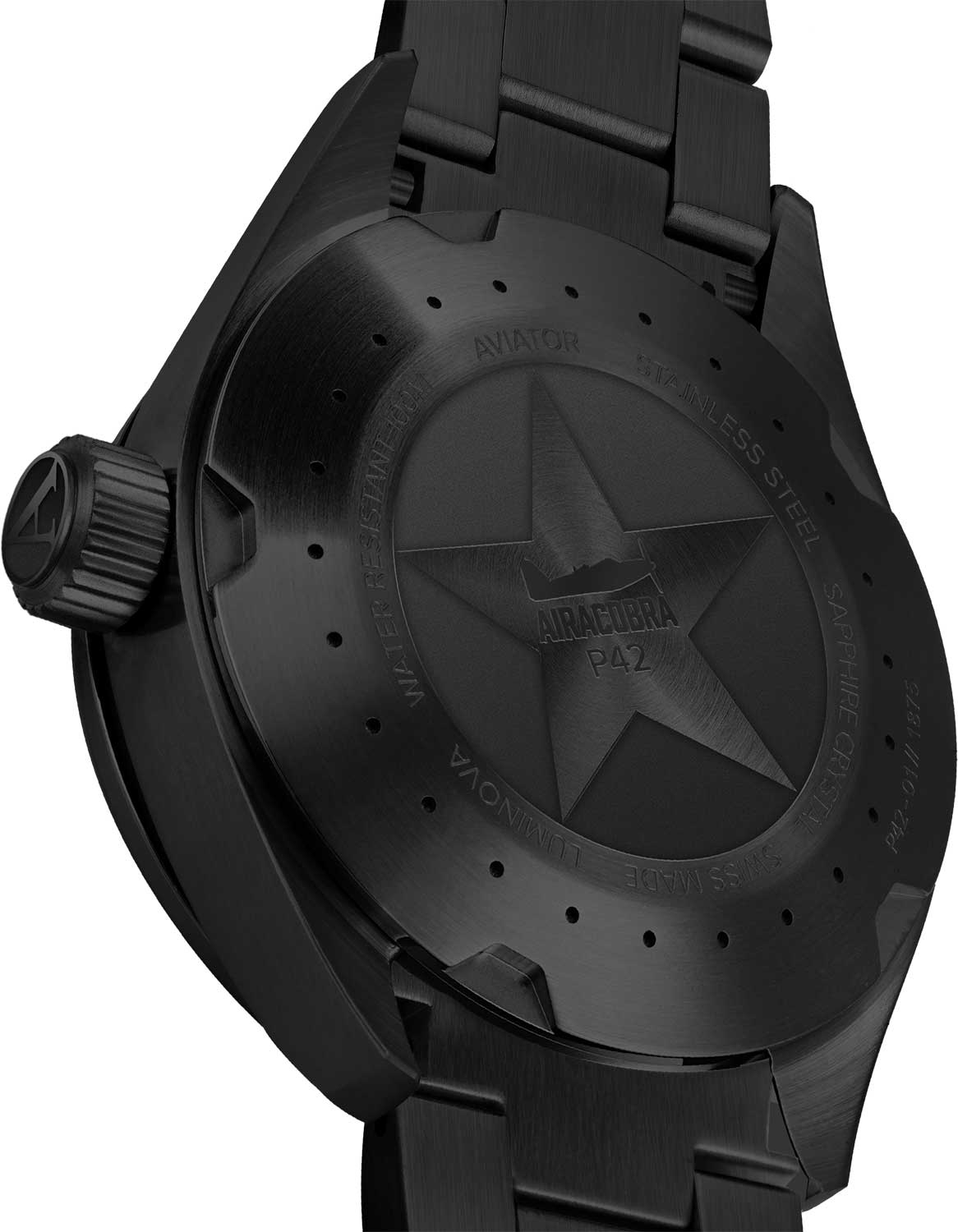 Aviator Airacobra P42 V.1.22.5.157.5 — швейцарские часы в классике авиадизайна, сочетающие безупречную читаемость и высокую надёжность. Корпус диаметром 42 мм выполнен из нержавеющей стали с элегантным PVD-покрытиемPVDУльтратонкое покрытие наносится в технике вакуумного напыления, сочетает в себе нитрид титана особой прочности со слоем золота или оксида хрома. Несёт в себе декоративную или защитную функцию.. Матовый циферблат с крупными арабскими цифрами, широкими стрелками и контрастной шкалой минут обеспечивает точную и быструю считываемость информации — как и положено настоящим пилотским часам. У отметки «3 часа» — окошко даты. Часовые метки и стрелки покрыты люминесцентным покрытиемЛюминесцентное покрытиеПозволяет считывать показания времени в темноте. Производители наносят на стрелки, часовые индексы, безель или поверхность циферблата светонакопительный состав, дающий холодное свечение. Superluminova, позволяющим легко определять время даже в тёмное время суток. Поверхность защищена прочным сапфировым стекломСапфировое стеклоПрочный и надёжный материал из кристалла сапфира синтетического происхождения, характеризующийся особой твёрдостью и устойчивостью к царапинам и повреждениям. с антибликовым покрытиемАнтибликовое покрытиеСлой оксида металла в 0,13-0,3 микрон, благодаря которому стекло часов не бликует и не отражает свет. Антибликовое покрытие уменьшает отражение света в 10 раз, обеспечивая отличную читаемость показателей циферблата., устойчивым к царапинам. Сердце модели — швейцарский кварцевый механизм Ronda 519, известный своей точностью и долговечностью. Корпус герметичен до 100 метров, что обеспечивает уверенную и надёжную защиту от влаги. Стальной браслет с PVD-покрытиемPVDУльтратонкое покрытие наносится в технике вакуумного напыления, сочетает в себе нитрид титана особой прочности со слоем золота или оксида хрома. Несёт в себе декоративную или защитную функцию. с раскладной застёжкойРаскладная застёжкаТакой тип застёжки используется только на браслетах из металла. Она никогда не раскрывается полностью, происходит разделение на 2 и более частей. Раскладывающая застёжка снизит вероятность потери часов к минимуму. обеспечивает удобство и надёжную фиксацию. Aviator — это образец лётной точности, инженерной чёткости и сдержанной роскоши, идеально подходящий для тех, кто ценит функциональность и уверенность в каждом элементе.