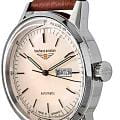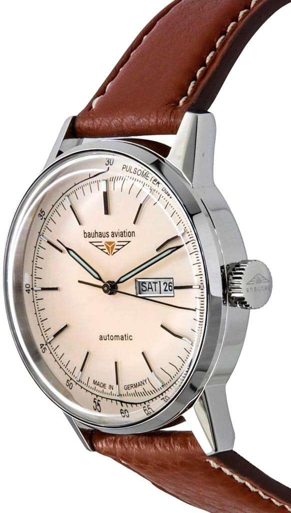 Мужские механические часы с автоподзаводом Bauhaus — это аксессуар в стиле авиационных хронометров. Корпус диаметром 42 мм и толщиной 14 мм выполнен из стали с комбинированной отделкой: матовой и полированной. Циферблат белого цвета выполнен по технологии Sunray («солнечные лучи») и оформлен штрихами и стрелками. Метки и стрелки с люминесцентным покрытиемЛюминесцентное покрытиеПозволяет считывать показания времени в темноте. Производители наносят на стрелки, часовые индексы, безель или поверхность циферблата светонакопительный состав, дающий холодное свечение., обеспечивающим хорошую читаемость в темноте. Окошко даты и дня недели расположено в положении 3 часов. На циферблате присутствует шкала пульсометра, рассчитанная на 30 ударов. Циферблат защищён прочным минеральным стекломМинеральное стеклоМинеральное стекло представляет собой искусственно выращенный минерал кварца. Такое стекло отличается особой устойчивостью к повреждениям и царапинам. Уступает по некоторым качествам сапфировому стеклу. K1. Механизм — автоматический калибр Miyota 8205 (21 камень, частота 21 600 полуколебаний в час) с запасом хода до 42 часов. Рифлёная заводная головка украшена фирменным логотипом. Прозрачная задняя крышка позволяет наблюдать за работой механизма. Часы оснащены кожаным ремешком с декоративной белой строчкой и классической пряжкой. Водонепроницаемость 100 м позволяет использовать часы для плавания и повседневного ношения. Идеальный выбор для тех, кто ценит немецкое качество и функциональный дизайн.