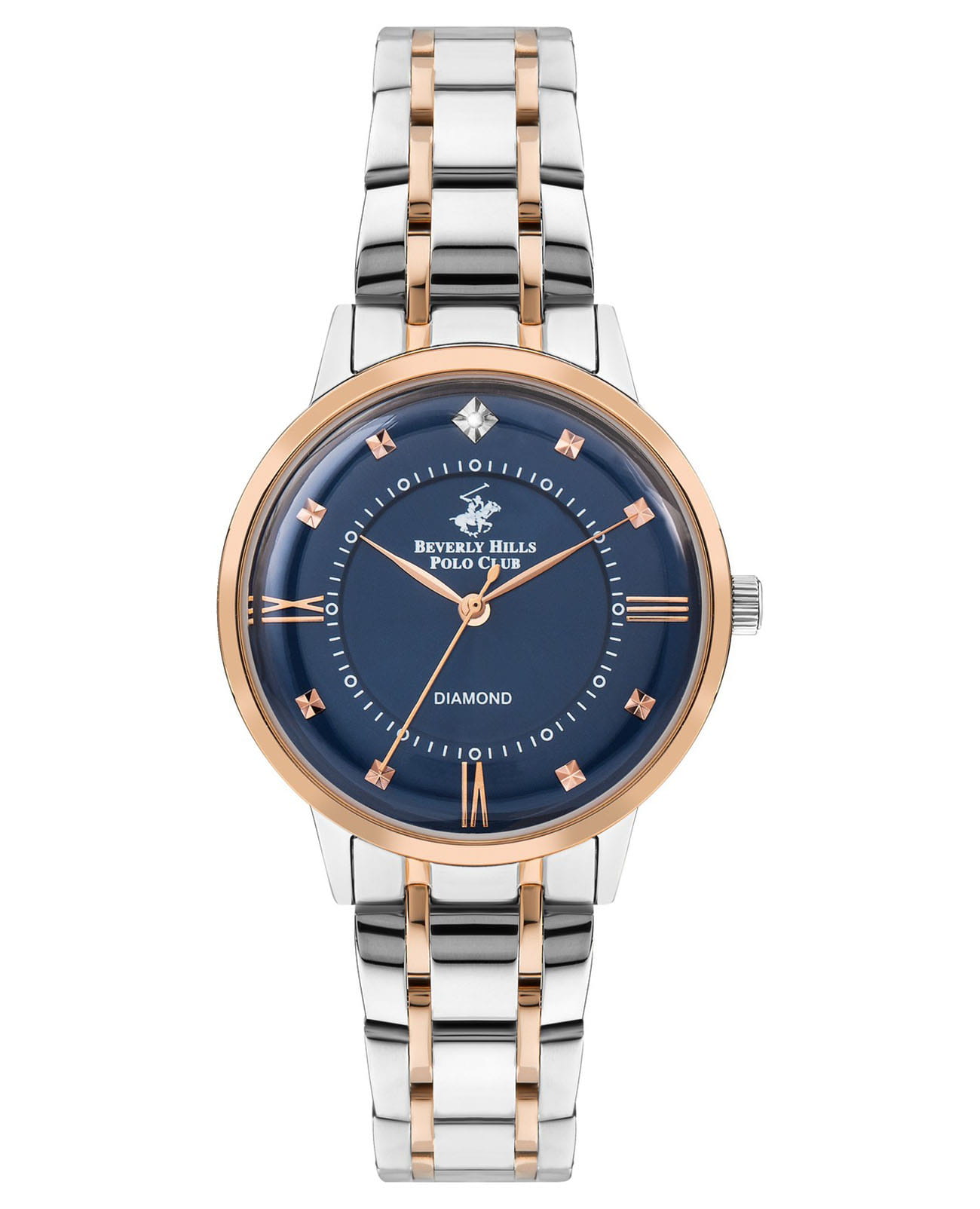 Американские женские часы с минеральным стекломМинеральное стеклоМинеральное стекло представляет собой искусственно выращенный минерал кварца. Такое стекло отличается особой устойчивостью к повреждениям и царапинам. Уступает по некоторым качествам сапфировому стеклу. Beverly Hills Polo Club BP3388C.590, кварцевый механизм с высокой точностью. Корпус и браслет часов изготовлены из нержавеющей стали с частичным IP-покрытиемIP-покрытиеМетод ионного напыления. Демонстрирует повышенную устойчивость к истиранию, окислению и химическим веществам. Под воздействием высокого давления и температуры около 1500°C молекулы металла надёжно соединяются с частицами корпуса часов.. Неподвижный безельБезельВнешний ободок, закрепляющий стекло. В спортивных часах так называется поворотное кольцо с делениями на циферблате, выполняет роль таймера – замеряет отрезки времени на шкале. Неподвижный безель – элемент декора. Однонаправленно вращающийся безель на дайверских часах позволяет фиксировать моменты погружения и выныривания на поверхность. из нержавеющей стали IP-покрытиемIP-покрытиеМетод ионного напыления. Демонстрирует повышенную устойчивость к истиранию, окислению и химическим веществам. Под воздействием высокого давления и температуры около 1500°C молекулы металла надёжно соединяются с частицами корпуса часов.. Циферблат украшен бриллиантом. Класс водозащиты: 50 метров, позволит защитить корпус от случайных брызг или капель дождя. Стальной браслет на раскладной застёжкеРаскладная застёжкаТакой тип застёжки используется только на браслетах из металла. Она никогда не раскрывается полностью, происходит разделение на 2 и более частей. Раскладывающая застёжка снизит вероятность потери часов к минимуму..