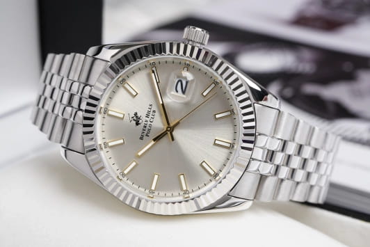 Мужские кварцевые часы Beverly Hills Polo Club — это воплощение элегантности и сдержанной роскоши. Корпус диаметром 41 мм выполнен из стали 316L. Циферблат бежевого цвета оформлен штрихами и стрелками. Стрелки и метки с люминесцентным покрытиемЛюминесцентное покрытиеПозволяет считывать показания времени в темноте. Производители наносят на стрелки, часовые индексы, безель или поверхность циферблата светонакопительный состав, дающий холодное свечение., обеспечивающим хорошую читаемость в темноте. Циферблат защищён минеральным стекломМинеральное стеклоМинеральное стекло представляет собой искусственно выращенный минерал кварца. Такое стекло отличается особой устойчивостью к повреждениям и царапинам. Уступает по некоторым качествам сапфировому стеклу.. Часы оснащены браслетом из стали 316L на застёжке «бабочка» с кнопкамиЗастёжка "бабочка"Такой вид застёжки дополняется предохранителями, помогающими избежать случайного раскрытия браслета. Обладают изящным исполнением. . Водонепроницаемость 50 м позволяет использовать часы в повседневных условиях. Идеальный выбор для тех, кто ценит американское качество и универсальный дизайн.