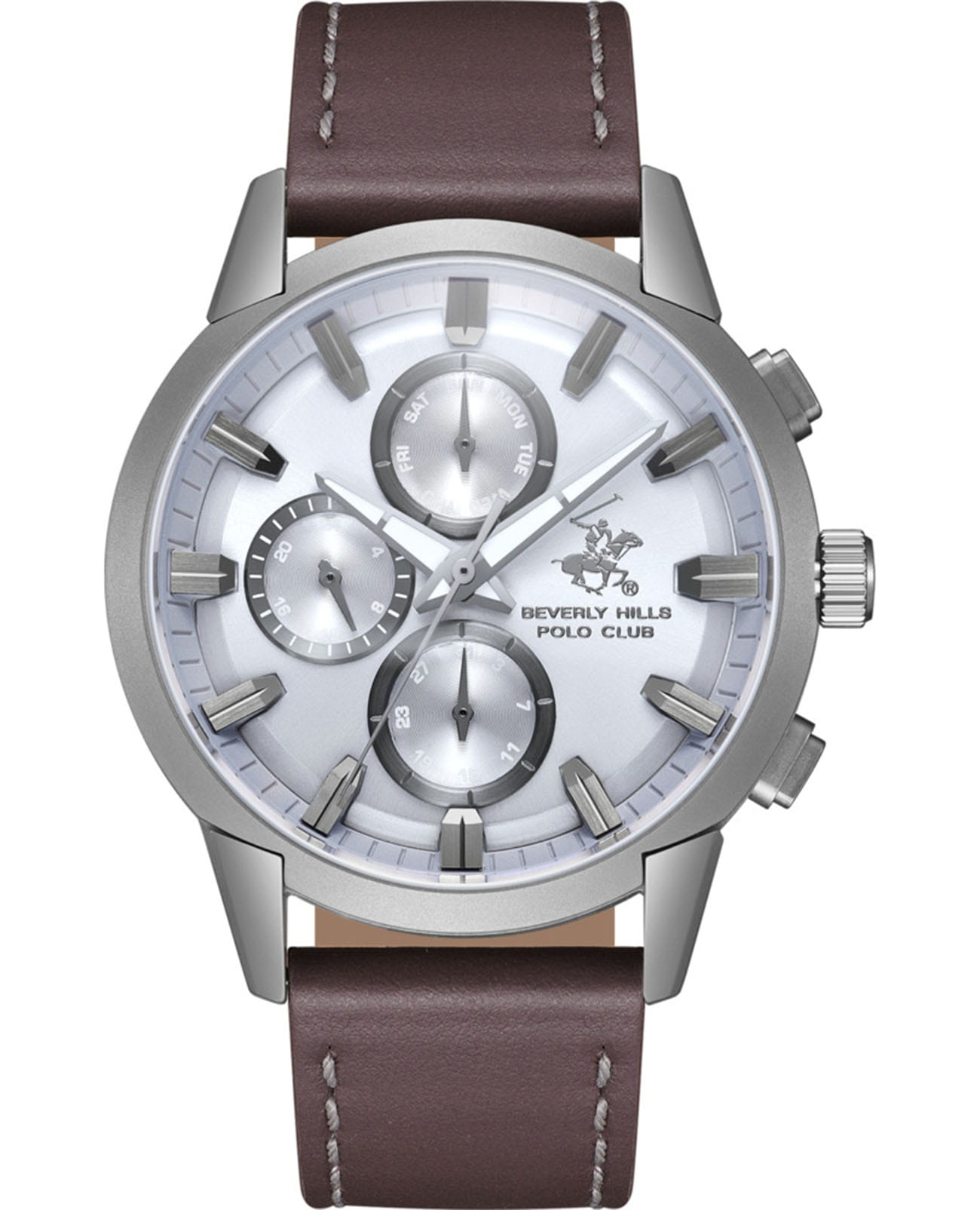 Мужские кварцевые часы Beverly Hills Polo Club — это надёжный и универсальный аксессуар. Корпус диаметром 44 мм выполнен из нержавеющей стали серебряного цвета. Циферблат серого цвета оформлен штрихами, стрелками и тремя вынесенными субциферблатами: для отображения дня недели, даты и второго часового пояса (GMTВторой часовой поясФункция, позволяющая отображать время двух часовых поясов одновременно.). Циферблат защищён минеральным стекломМинеральное стеклоМинеральное стекло представляет собой искусственно выращенный минерал кварца. Такое стекло отличается особой устойчивостью к повреждениям и царапинам. Уступает по некоторым качествам сапфировому стеклу., устойчивым к царапинам. Стрелки и метки с люминесцентным покрытиемЛюминесцентное покрытиеПозволяет считывать показания времени в темноте. Производители наносят на стрелки, часовые индексы, безель или поверхность циферблата светонакопительный состав, дающий холодное свечение., обеспечивающим хорошую читаемость в темноте. Часы оснащены коричневым кожаным ремешком на классической пряжке. Водонепроницаемость 100 м позволяет использовать часы для плавания и повседневного ношения. Идеальный выбор для тех, кто ценит американское качество и функциональный дизайн.