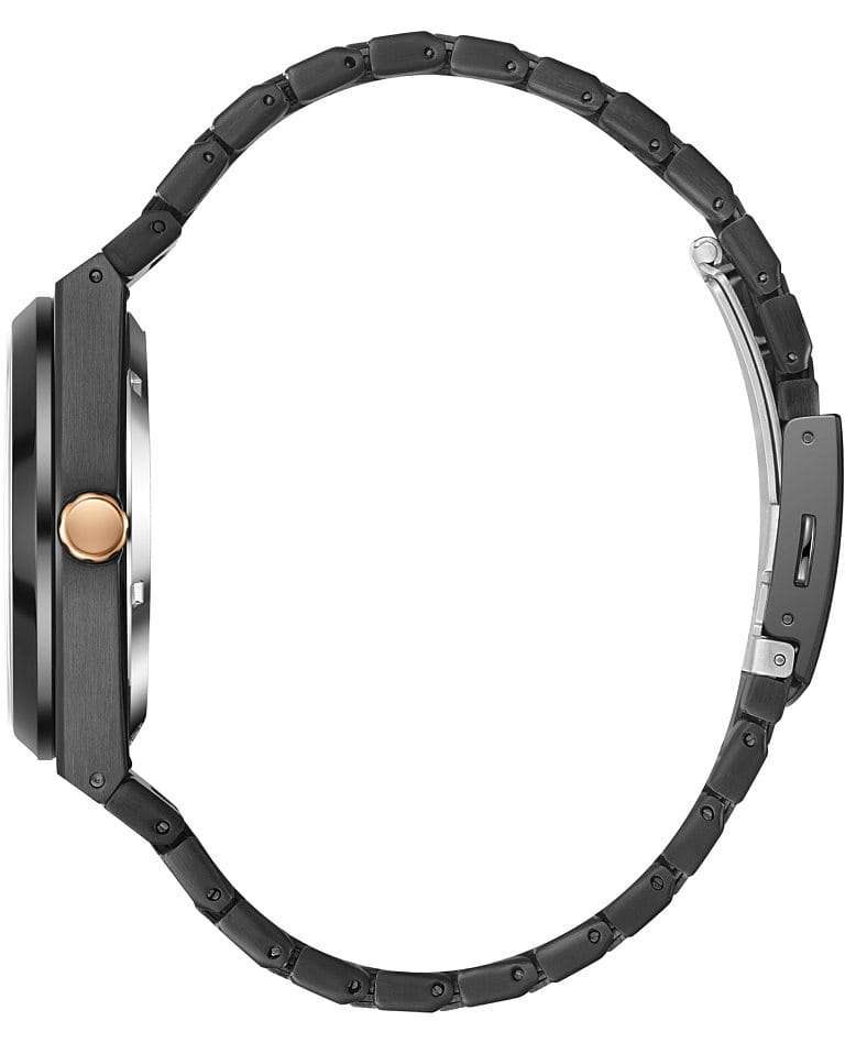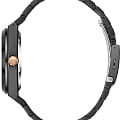 Модель оснащена механизмом, обеспечивающим точное измерение времени. Металлический браслет черного цвета PVD-покрытиемPVDУльтратонкое покрытие наносится в технике вакуумного напыления, сочетает в себе нитрид титана особой прочности со слоем золота или оксида хрома. Несёт в себе декоративную или защитную функцию. дополнен раскладной застёжкой с кнопкойРаскладная застёжкаТакой тип застёжки используется только на браслетах из металла. Она никогда не раскрывается полностью, происходит разделение на 2 и более частей. Раскладывающая застёжка снизит вероятность потери часов к минимуму., которая обеспечивает комфортное ношение и надёжную фиксацию.