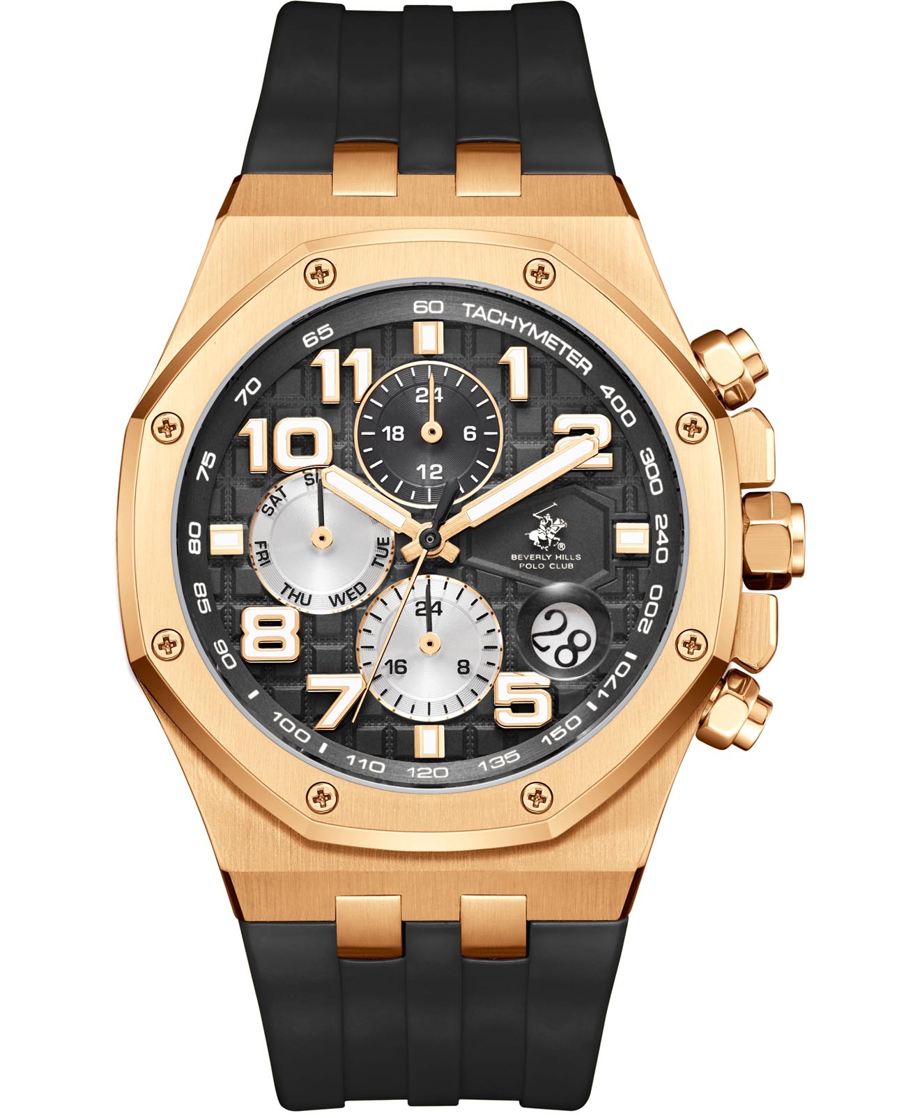 Американские мужские часы Beverly Hills Polo Club BP3783X.451 - это стильный мужской аксессуар, который сочетает элегантный дизайн и практичность. Корпус выполнен из нержавеющей стали с IP-покрытиемIP-покрытиеМетод ионного напыления. Демонстрирует повышенную устойчивость к истиранию, окислению и химическим веществам. Под воздействием высокого давления и температуры около 1500°C молекулы металла надёжно соединяются с частицами корпуса часов. цвета розового золота, диаметром 42 мм, что обеспечивает долговечность и утончённый внешний вид. Надежное минеральное стеклоМинеральное стеклоМинеральное стекло представляет собой искусственно выращенный минерал кварца. Такое стекло отличается особой устойчивостью к повреждениям и царапинам. Уступает по некоторым качествам сапфировому стеклу. с сапфировым покрытием защищает циферблат от царапин и обеспечивает долговечность. Модель оснащена кварцевым механизмом, обеспечивающим высокую точность хода. Каучуковый ремешок на стандартной застежке обеспечивает комфортное ношение. Функциональность модели расширена за счёт индикации даты, дня недели, дополнительным 24-х часовым индикатором и тахиметраТахиметрРазмеченная шкала, располагается на ободке или безеле часов. Тахиметр позволяет рассчитать скорость на определённом участке пути, расстояние измеряется в километрах или милях.. Стрелки и метки с люминесцентным покрытиемЛюминесцентное покрытиеПозволяет считывать показания времени в темноте. Производители наносят на стрелки, часовые индексы, безель или поверхность циферблата светонакопительный состав, дающий холодное свечение. позволяют легко считывать время даже в условиях недостаточного освещения. Водозащита 50 метров позволит защитить корпус от случайных брызг или капель дождя. Эта модель – отличный выбор для тех, кто ищет сочетание стиля, качества и функциональности. Часы станут не только полезным аксессуаром, но и выразительным элементом вашего имиджа.