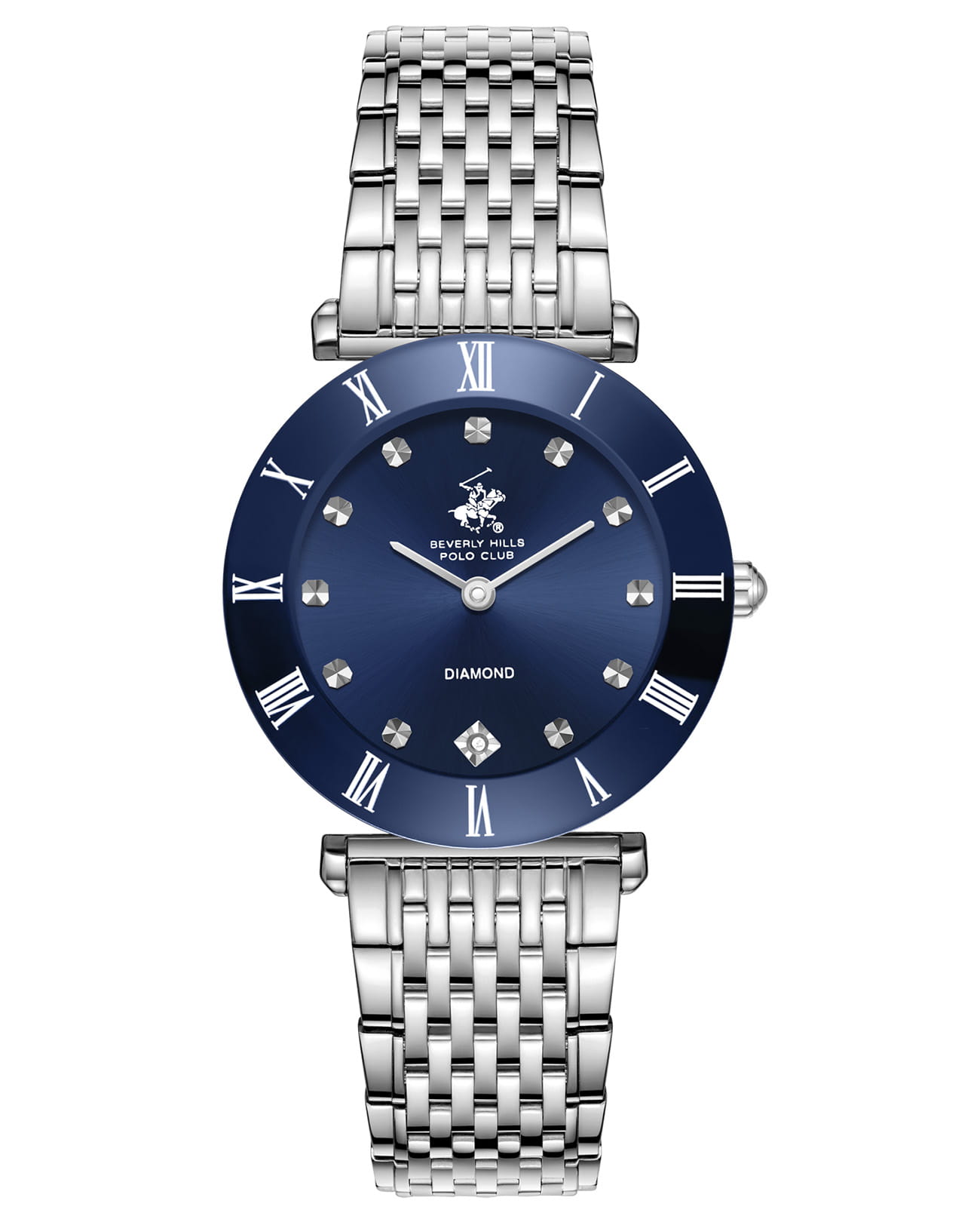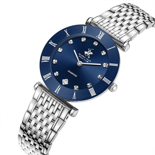 Женские кварцевые часы Beverly Hills Polo Club — это символ элегантного стиля и безупречного вкуса. Корпус диаметром 30 мм выполнен из суперметалла. БезельБезельВнешний ободок, закрепляющий стекло. В спортивных часах так называется поворотное кольцо с делениями на циферблате, выполняет роль таймера – замеряет отрезки времени на шкале. Неподвижный безель – элемент декора. Однонаправленно вращающийся безель на дайверских часах позволяет фиксировать моменты погружения и выныривания на поверхность. из суперметалла с IP-покрытиемIP-покрытиеМетод ионного напыления. Демонстрирует повышенную устойчивость к истиранию, окислению и химическим веществам. Под воздействием высокого давления и температуры около 1500°C молекулы металла надёжно соединяются с частицами корпуса часов.. Циферблат синего цвета оформлен римскими цифрами, стрелками и инкрустирован одним синтетическим бриллиантом. Циферблат защищён минеральным стекломМинеральное стеклоМинеральное стекло представляет собой искусственно выращенный минерал кварца. Такое стекло отличается особой устойчивостью к повреждениям и царапинам. Уступает по некоторым качествам сапфировому стеклу. с сапфировым покрытием. Часы оснащены стальным браслетом на застёжке «бабочка» с кнопкамиЗастёжка "бабочка"Такой вид застёжки дополняется предохранителями, помогающими избежать случайного раскрытия браслета. Обладают изящным исполнением. . Водонепроницаемость 30 м позволяет использовать часы в повседневных условиях. Идеальный выбор для тех, кто ценит американское качество и универсальный дизайн.
