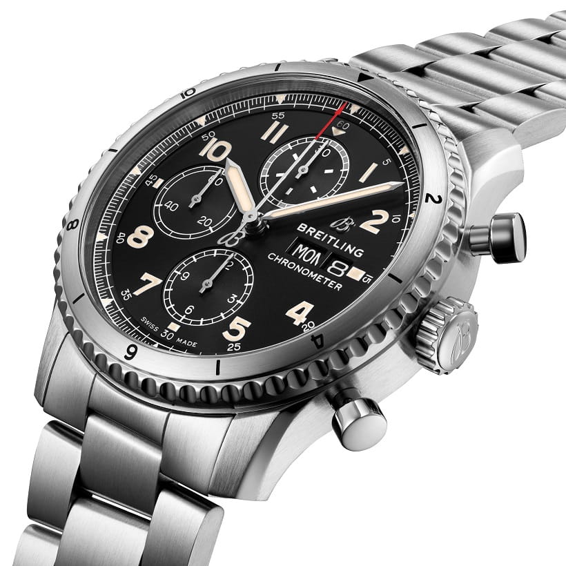 Модель Aviator 8 Chronograph 43 A13316101B1A1 оснащена 30-минутным и 12-часовым счетчиками, расположенными в положении «12» и «6 часов», а также малой секундной стрелкой в положении «9 часов». Уровень точности достигает 1/4 секунды. «Сердце» данной модели – калибр Breitling Caliber 13, подтвержденный сертификатом Швейцарского института официального тестирования хронометров (COSC). Он приводится в действие однонаправленным ротором с шарикоподшипниками и обладает запасом хода более 42 часов. Сплошная крышка корпуса диаметром 43 мм крепится на винтах.