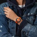 Класс водозащиты: 200 метров, позволит плавать, нырять и заниматься другими водными видами спорта. Корпус часов изготовлен из нержавеющей стали, серебристого цвета. Оранжевый каучуковый ремешок с классической застежкой из нержавеющей стали.