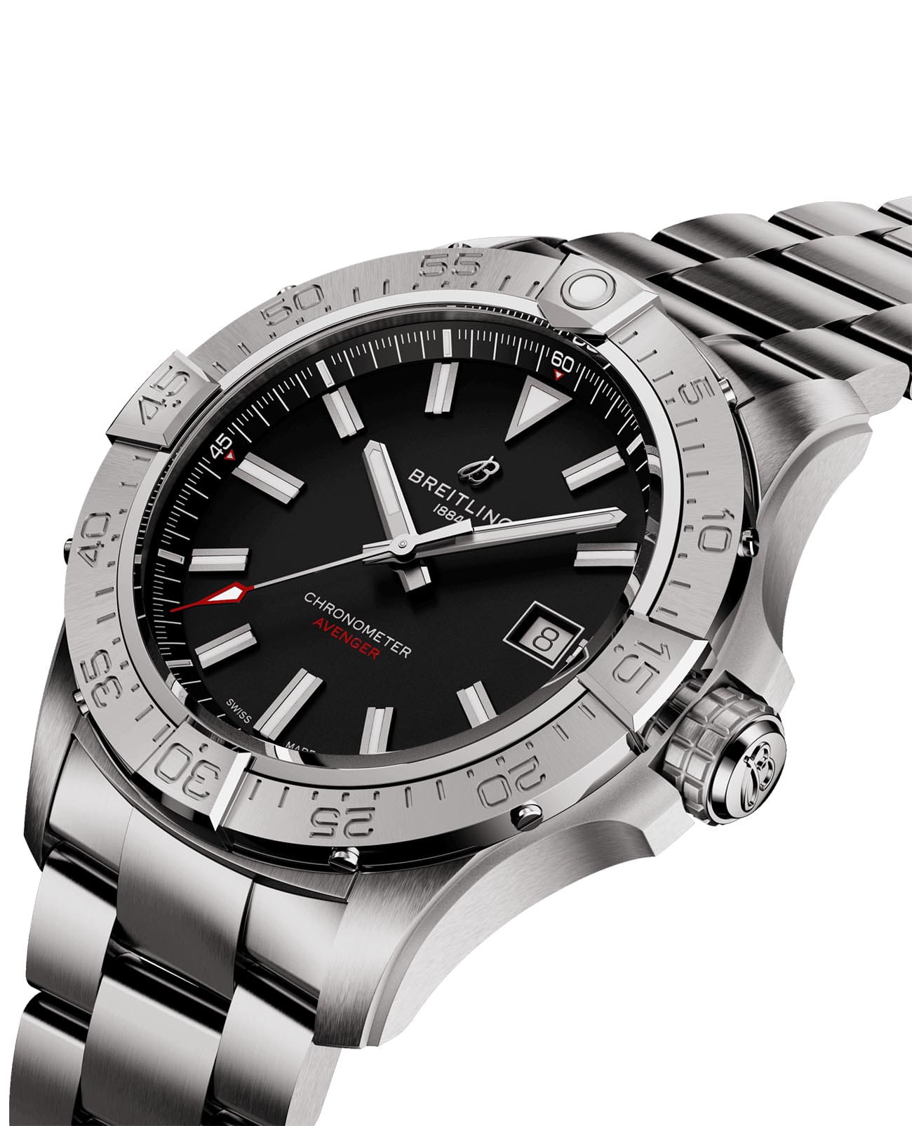 Мужские наручные часы Breitling Avenger Automatic 42 A17328101B1A1 с надёжным автоматическим механизмом. Сапфировое стеклоСапфировое стеклоПрочный и надёжный материал из кристалла сапфира синтетического происхождения, характеризующийся особой твёрдостью и устойчивостью к царапинам и повреждениям. повышенной прозрачности, устойчивое к мелким механическим повреждениям. Вращающийся безельБезельВнешний ободок, закрепляющий стекло. В спортивных часах так называется поворотное кольцо с делениями на циферблате, выполняет роль таймера – замеряет отрезки времени на шкале. Неподвижный безель – элемент декора. Однонаправленно вращающийся безель на дайверских часах позволяет фиксировать моменты погружения и выныривания на поверхность.. Окошко даты находится в положении 3 часа. Стрелки и метки с люминесцентным покрытиемЛюминесцентное покрытиеПозволяет считывать показания времени в темноте. Производители наносят на стрелки, часовые индексы, безель или поверхность циферблата светонакопительный состав, дающий холодное свечение.. Стальной браслет на стандартной застёжке. Класс водозащиты: 300 метров, позволит плавать, нырять и заниматься другими водными видами спорта.