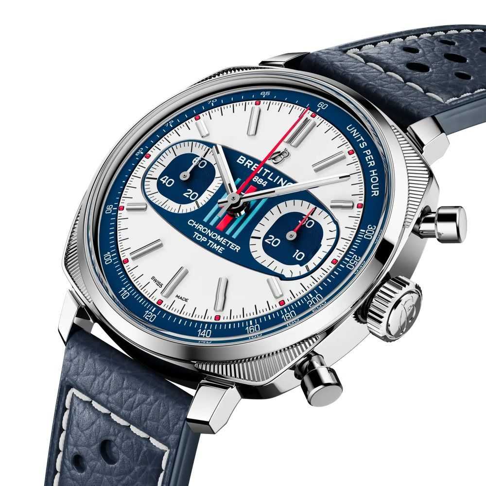Breitling Top Time B31 AB01772A1G1X1 — стильная новинка 2025 года с характерной винтажной эстетикой и современным механизмом собственного производства. Корпус диаметром 38 мм выполнен из нержавеющей стали с полированной отделкой. Циферблат защищён выпуклым сапфировым стекломСапфировое стеклоПрочный и надёжный материал из кристалла сапфира синтетического происхождения, характеризующийся особой твёрдостью и устойчивостью к царапинам и повреждениям. с двухсторонним антибликовым покрытиемАнтибликовое покрытиеСлой оксида металла в 0,13-0,3 микрон, благодаря которому стекло часов не бликует и не отражает свет. Антибликовое покрытие уменьшает отражение света в 10 раз, обеспечивая отличную читаемость показателей циферблата.. Циферблат с контрастным внутренним кольцом и яркой оранжевой секундной стрелкой оформлен в узнаваемом стиле коллекции Top Time. Стрелки и часовые метки имеют люминесцентное покрытиеЛюминесцентное покрытиеПозволяет считывать показания времени в темноте. Производители наносят на стрелки, часовые индексы, безель или поверхность циферблата светонакопительный состав, дающий холодное свечение., обеспечивающее отличную читаемость. Внутри установлен автоматический калибр Breitling B31, отображающий часы, минуты, малую секунду и дату. Механизм обеспечивает запас хода до 78 часов и работает с частотой 28 800 полуколебаний в час. Часы укомплектованы перфорированным кожаным ремешком и классической застёжкой-пряжкой. Водонепроницаемость 100 метров делает модель универсальной для повседневного использования. Top Time B31 AB01772A1G1X1 — гармония винтажного дизайна и инновационного часового мастерства.