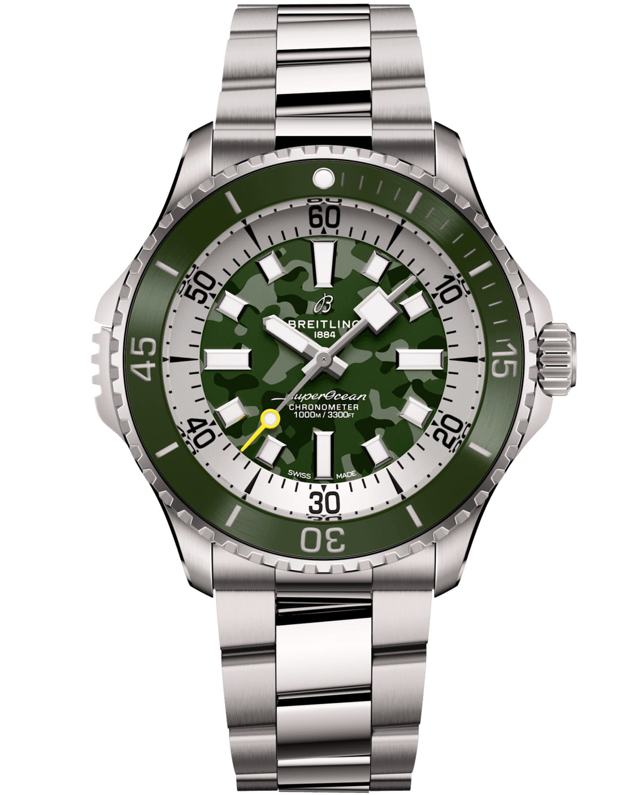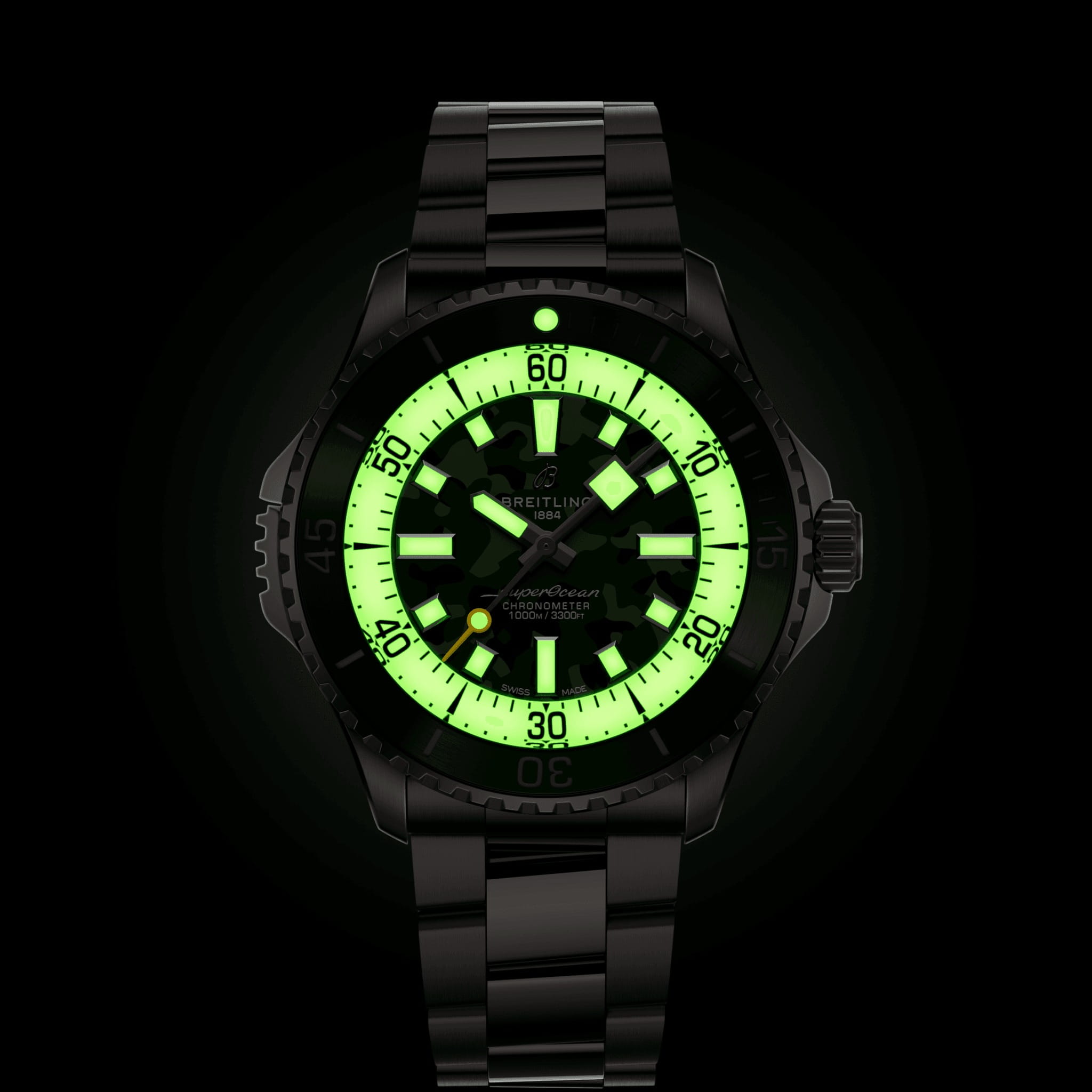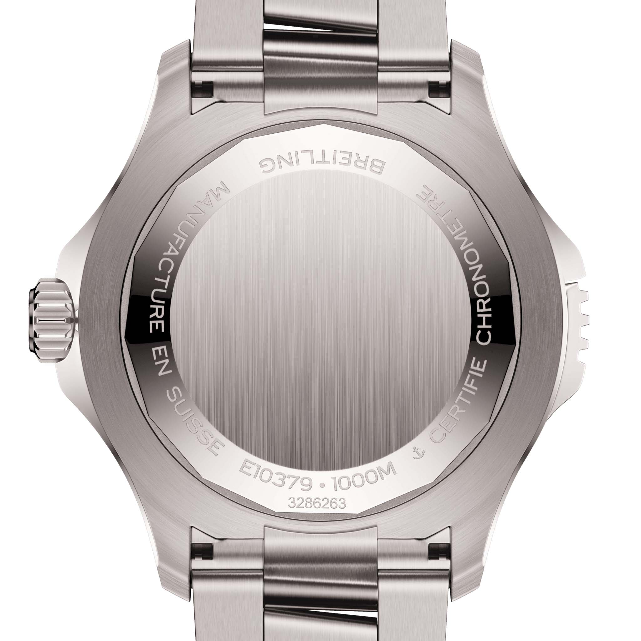 Мужские водонепроницаемые швейцарские часы Breitling Superocean Automatic 46 Super Diver E10379D31L1E1, механический механизм (автоматический калибр) с высокой точностью. Сапфировое стеклоСапфировое стеклоПрочный и надёжный материал из кристалла сапфира синтетического происхождения, характеризующийся особой твёрдостью и устойчивостью к царапинам и повреждениям. устойчивое к появлению царапин, обладающее высокой прозрачностью. Класс водозащиты: 1000 метров, позволит плавать, нырять и заниматься другими водными видами спорта. Корпус часов изготовлен из титана. Титановй браслет с раскладной застёжкойРаскладная застёжкаТакой тип застёжки используется только на браслетах из металла. Она никогда не раскрывается полностью, происходит разделение на 2 и более частей. Раскладывающая застёжка снизит вероятность потери часов к минимуму.. Стрелки и метки с люминесцентным покрытиемЛюминесцентное покрытиеПозволяет считывать показания времени в темноте. Производители наносят на стрелки, часовые индексы, безель или поверхность циферблата светонакопительный состав, дающий холодное свечение.. Широкие стрелки и индексы с люминесцентным покрытиемЛюминесцентное покрытиеПозволяет считывать показания времени в темноте. Производители наносят на стрелки, часовые индексы, безель или поверхность циферблата светонакопительный состав, дающий холодное свечение. обеспечивают легкую читаемость под водой. Вращающийся стальной безельБезельВнешний ободок, закрепляющий стекло. В спортивных часах так называется поворотное кольцо с делениями на циферблате, выполняет роль таймера – замеряет отрезки времени на шкале. Неподвижный безель – элемент декора. Однонаправленно вращающийся безель на дайверских часах позволяет фиксировать моменты погружения и выныривания на поверхность. с люминесцентным покрытиемЛюминесцентное покрытиеПозволяет считывать показания времени в темноте. Производители наносят на стрелки, часовые индексы, безель или поверхность циферблата светонакопительный состав, дающий холодное свечение. Superluminova из нержавеющей стали и керамики, защищенный от царапин, никогда не изнашивается и не выцветает.