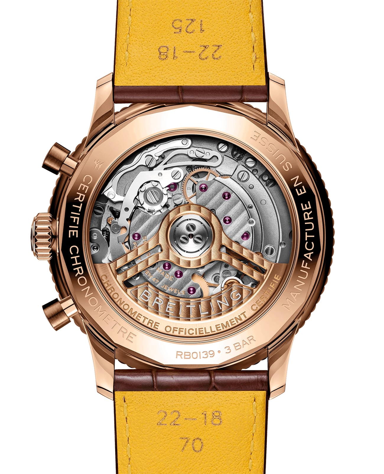 Мужские швейцарские часы-хронографХронографФункция позволяет измерять отрезки времени с особой точностью: часы, минуты, секунды. Верным признаком хронографа является наличие на циферблате 3 дополнительных окошек-счётчиков. с секундомеромСекундомерСекундоме́р — прибор, способный измерять интервалы времени с точностью до долей секунды. Breitling Navitimer B01 Chronograph 41 RB0139631G1P1, механический механизм (автоматический калибр) с высокой точностью. С момента своего дебюта 70 лет назад icon от Breitling претерпел множество модификаций, но этот новый Navitimer отражает его самые классические функции, дополняя их современными усовершенствованиями. Сплющенная логарифмическая линейка и выпуклый кристалл создают иллюзию более изящного профиля. Сапфировое стеклоСапфировое стеклоПрочный и надёжный материал из кристалла сапфира синтетического происхождения, характеризующийся особой твёрдостью и устойчивостью к царапинам и повреждениям. устойчивое к появлению царапин, обладающее высокой прозрачностью. Класс водозащиты: 30 метров, позволит защитить корпус от случайных брызг или капель дождя. Корпус часов изготовлен из красного 18-каратного золота18-каратное золотоОбозначение по каратной системе пробирования, оно показывает, сколько драгоценного металла содержится в изделии. 18 карат - в составе 75% чистого золота, соответствует 750 пробе.
