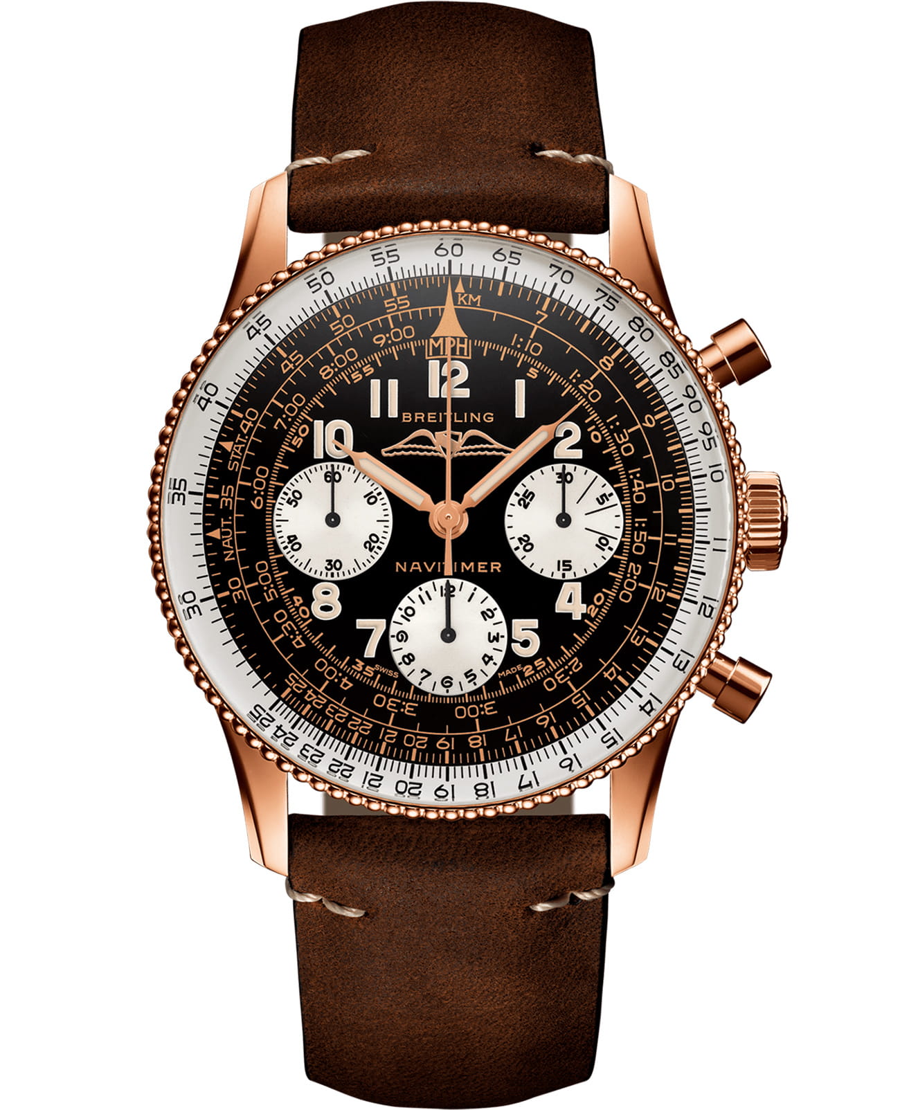 Navitimer 1959 Edition в корпусе из 18-каратного розового золота оснащены черным циферблатом с белыми контрастными счетчиками хронографа. Как и у выпущенных в 1959 году Navitimer Ref. 806, циферблат обновленной модели защищен сферическим органическим стеклом, украшен надписью BREITLING и логотипом в виде крыльев без фирменного вензеля. Единственными отступлениями от оригинала стали показатель водонепроницаемости корпуса, который в современной модели увеличен до 3 бар (30 метров), и наличие покрытия Super-LumiNova®, цвет которого максимально соответствует цвету того люминесцентного материала, который применялся в более ранних моделях коллекции. Покрытие, нанесенное вручную, придает циферблату винтажный стиль и подчеркивает индивидуальный характер часов.