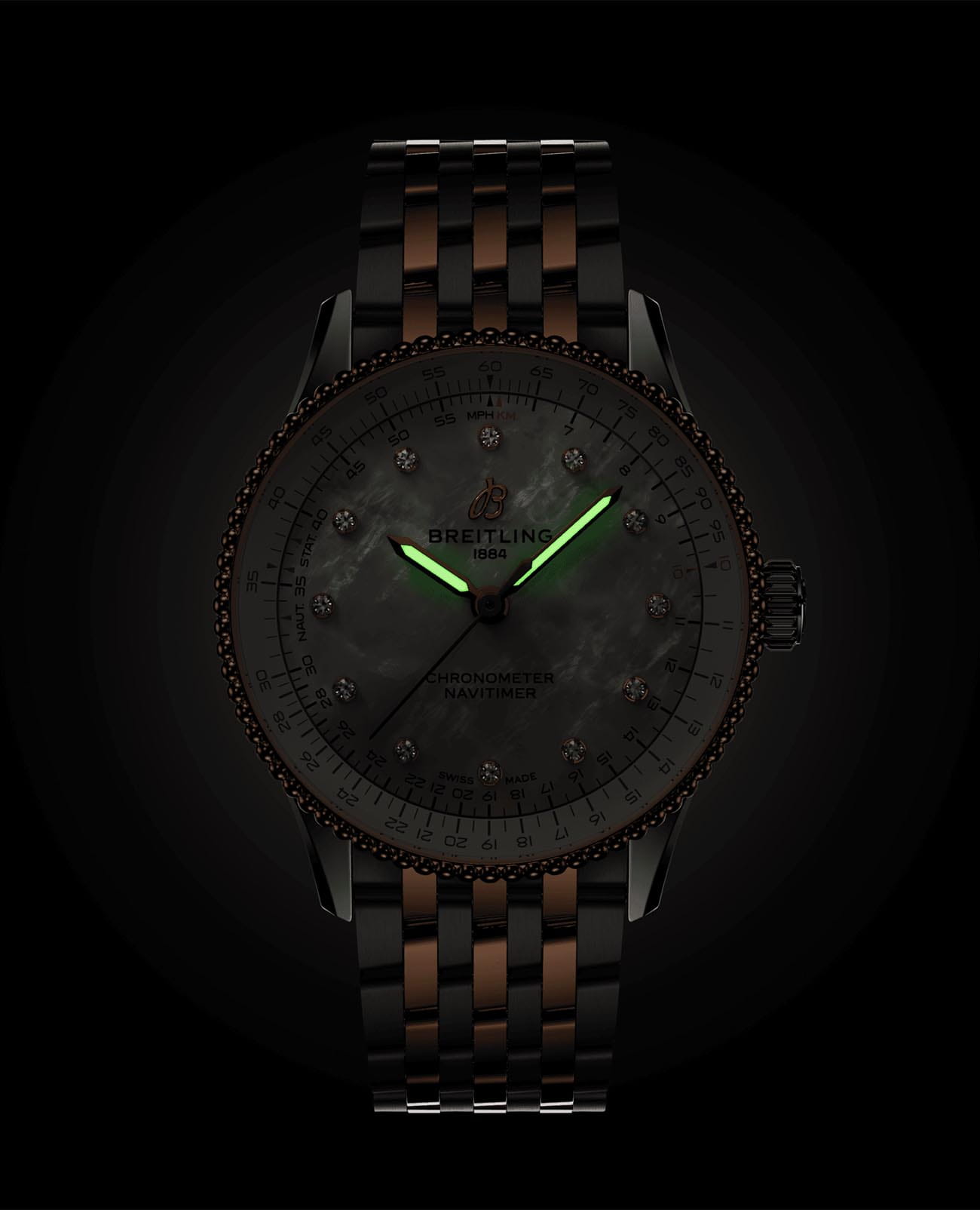 на застёжке-бабочке с кнопкамиЗастёжка "бабочка"Такой вид застёжки дополняется предохранителями, помогающими избежать случайного раскрытия браслета. Обладают изящным исполнением. . Стрелки с люминесцентным покрытиемЛюминесцентное покрытиеПозволяет считывать показания времени в темноте. Производители наносят на стрелки, часовые индексы, безель или поверхность циферблата светонакопительный состав, дающий холодное свечение.. БезельБезельВнешний ободок, закрепляющий стекло. В спортивных часах так называется поворотное кольцо с делениями на циферблате, выполняет роль таймера – замеряет отрезки времени на шкале. Неподвижный безель – элемент декора. Однонаправленно вращающийся безель на дайверских часах позволяет фиксировать моменты погружения и выныривания на поверхность. из золота 18 карат. Циферблат украшен бриллантами. Часы оснащены логарифмической линейкой.