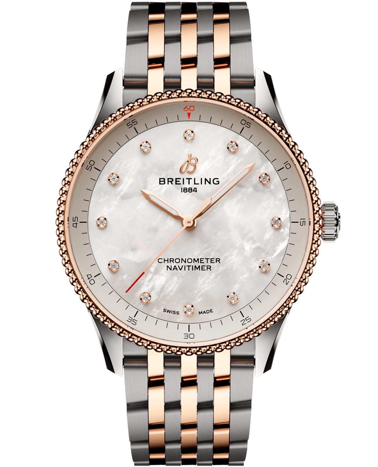 Швейцарские унисекс часы-хронометр Breitling Navitimer Automatic 32 U77320E61A1U1, механический механизм (автоматический калибр) с высокой точностью. Сапфировое стеклоСапфировое стеклоПрочный и надёжный материал из кристалла сапфира синтетического происхождения, характеризующийся особой твёрдостью и устойчивостью к царапинам и повреждениям. устойчивое к появлению царапин, обладающее высокой прозрачностью. Класс водозащиты: 50 метров, позволит защитить корпус от случайных брызг или капель дождя. Корпус часов изготовлен из нержавеющей стали. Браслет из стали и красного 18-каратного золота18-каратное золотоОбозначение по каратной системе пробирования, оно показывает, сколько драгоценного металла содержится в изделии. 18 карат - в составе 75% чистого золота, соответствует 750 пробе.