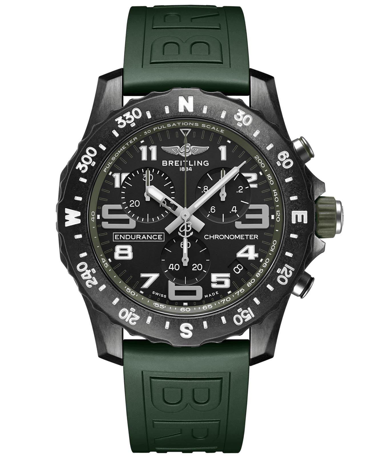 Швейцарские спортивные часы-хронографХронографФункция позволяет измерять отрезки времени с особой точностью: часы, минуты, секунды. Верным признаком хронографа является наличие на циферблате 3 дополнительных окошек-счётчиков. с секундомеромСекундомерСекундоме́р — прибор, способный измерять интервалы времени с точностью до долей секунды. Breitling Endurance Pro X82310D31B1S1, кварцевый механизм с высокой точностью. Разработанные как легкие часы для спортсменов, так и повседневный спортивный хронограф Endurance Pro идеально сочетают высокую точность и инновационные технологии с ярким и красочным дизайном. Сапфировое стеклоСапфировое стеклоПрочный и надёжный материал из кристалла сапфира синтетического происхождения, характеризующийся особой твёрдостью и устойчивостью к царапинам и повреждениям. с антибликовым покрытием устойчивое к появлению царапин, обладающее высокой прозрачностью. Класс водозащиты: 100 метров, позволит плавать, нырять и заниматься другими водными видами спорта. Корпус часов изготовлен из уникального материала Breitlight®, который в 3,3 раза легче титана и в 5,8 раза легче нержавеющей стали. Немагнитный, термостойкий и гипоаллергенный материал Breitlight ® обладает высокой устойчивостью к царапинам, сцеплению и коррозии. Стрелки и метки с люминесцентным покрытиемЛюминесцентное покрытиеПозволяет считывать показания времени в темноте. Производители наносят на стрелки, часовые индексы, безель или поверхность циферблата светонакопительный состав, дающий холодное свечение.. Силиконовый ремешок на стандартной застёжке. Часы имеют сертификат COSCСертификат COSCОфициальный сертификат, подтверждающий то, что часы ходят с особо высокой точностью. Для получения документа часы подвергаются тестовым испытаниям, разработанным швейцарским институтом тестирования хронометров COSC. Допустимая норма для механических часов -4/+6 секунд в день, для кварцевых моделей +/- 0,07 секунд в день.. Двунаправленный безельБезельВнешний ободок, закрепляющий стекло. В спортивных часах так называется поворотное кольцо с делениями на циферблате, выполняет роль таймера – замеряет отрезки времени на шкале. Неподвижный безель – элемент декора. Однонаправленно вращающийся безель на дайверских часах позволяет фиксировать моменты погружения и выныривания на поверхность. с выгравированной шкалой компаса.