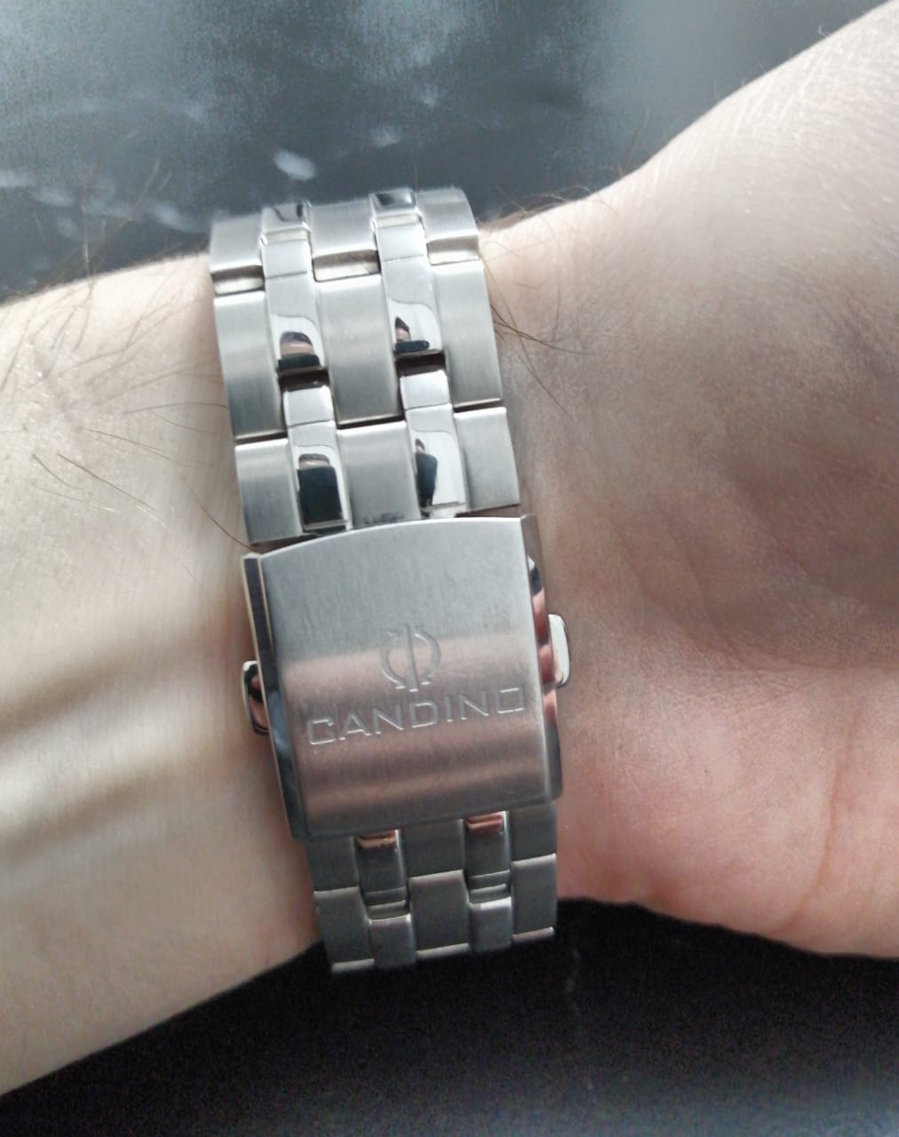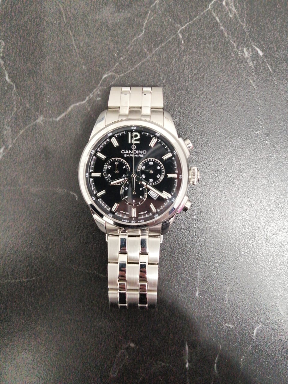 Швейцарские мужские наручные часы-хронографХронографФункция позволяет измерять отрезки времени с особой точностью: часы, минуты, секунды. Верным признаком хронографа является наличие на циферблате 3 дополнительных окошек-счётчиков. Candino Chronograph C4744/6, кварцевый механизм с высокой точностью. Сапфировое стеклоСапфировое стеклоПрочный и надёжный материал из кристалла сапфира синтетического происхождения, характеризующийся особой твёрдостью и устойчивостью к царапинам и повреждениям. устойчивое к появлению царапин, обладающее высокой прозрачностью. Часы, минуты, секунды. Окошко даты находится в положении между 4 и 5 часов. Класс водозащиты: 100 метров, позволит плавать, нырять и заниматься другими водными видами спорта. Раскладная застёжкаРаскладная застёжкаТакой тип застёжки используется только на браслетах из металла. Она никогда не раскрывается полностью, происходит разделение на 2 и более частей. Раскладывающая застёжка снизит вероятность потери часов к минимуму. с фиксатором. Корпус часов изготовлен из нержавеющей стали. Стрелки и метки с люминесцентным покрытиемЛюминесцентное покрытиеПозволяет считывать показания времени в темноте. Производители наносят на стрелки, часовые индексы, безель или поверхность циферблата светонакопительный состав, дающий холодное свечение..