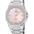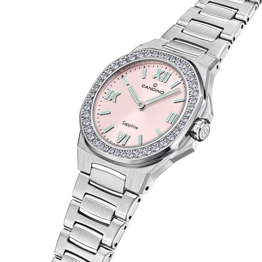 Женские наручные часы Candino Elegance C4753/3 с надёжным кварцевым механизмом. Корпус и браслет часов изготовлены из нержавеющей стали. Сапфировое стеклоСапфировое стеклоПрочный и надёжный материал из кристалла сапфира синтетического происхождения, характеризующийся особой твёрдостью и устойчивостью к царапинам и повреждениям. повышенной прозрачности, устойчивое к мелким механическим повреждениям. Стальной браслет на раскладной застёжкеРаскладная застёжкаТакой тип застёжки используется только на браслетах из металла. Она никогда не раскрывается полностью, происходит разделение на 2 и более частей. Раскладывающая застёжка снизит вероятность потери часов к минимуму.. Стрелки и метки с люминесцентным покрытиемЛюминесцентное покрытиеПозволяет считывать показания времени в темноте. Производители наносят на стрелки, часовые индексы, безель или поверхность циферблата светонакопительный состав, дающий холодное свечение.. БезельБезельВнешний ободок, закрепляющий стекло. В спортивных часах так называется поворотное кольцо с делениями на циферблате, выполняет роль таймера – замеряет отрезки времени на шкале. Неподвижный безель – элемент декора. Однонаправленно вращающийся безель на дайверских часах позволяет фиксировать моменты погружения и выныривания на поверхность. инкрустирован кристаллами. Класс водозащиты: 50 метров, позволит защитить корпус от случайных брызг или капель дождя.