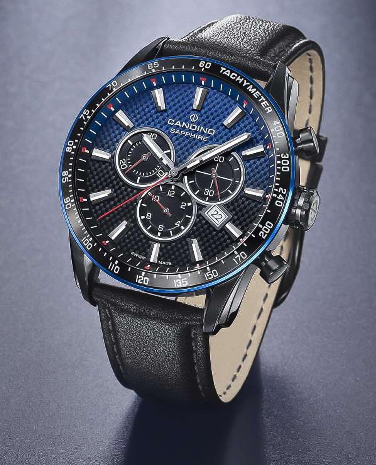 Швейцарские мужские наручные часы-хронографХронографФункция позволяет измерять отрезки времени с особой точностью: часы, минуты, секунды. Верным признаком хронографа является наличие на циферблате 3 дополнительных окошек-счётчиков. Candino Gents Sport C4759/2, кварцевый механизм с высокой точностью. Сапфировое стеклоСапфировое стеклоПрочный и надёжный материал из кристалла сапфира синтетического происхождения, характеризующийся особой твёрдостью и устойчивостью к царапинам и повреждениям. устойчивое к появлению царапин, обладающее высокой прозрачностью. Часы, минуты, секунды. Окошко даты находится в положении 4 часа. Класс водозащиты: 100 метров, позволит плавать, нырять и заниматься другими водными видами спорта. Корпус часов изготовлен из нержавеющей стали с PVD-покрытиемPVDУльтратонкое покрытие наносится в технике вакуумного напыления, сочетает в себе нитрид титана особой прочности со слоем золота или оксида хрома. Несёт в себе декоративную или защитную функцию.. Стрелки и метки с люминесцентным покрытиемЛюминесцентное покрытиеПозволяет считывать показания времени в темноте. Производители наносят на стрелки, часовые индексы, безель или поверхность циферблата светонакопительный состав, дающий холодное свечение.. Кожаный ремешок на стандартной застёжке. БезельБезельВнешний ободок, закрепляющий стекло. В спортивных часах так называется поворотное кольцо с делениями на циферблате, выполняет роль таймера – замеряет отрезки времени на шкале. Неподвижный безель – элемент декора. Однонаправленно вращающийся безель на дайверских часах позволяет фиксировать моменты погружения и выныривания на поверхность. со шкалой тахиметраТахиметрРазмеченная шкала, располагается на ободке или безеле часов. Тахиметр позволяет рассчитать скорость на определённом участке пути, расстояние измеряется в километрах или милях..
