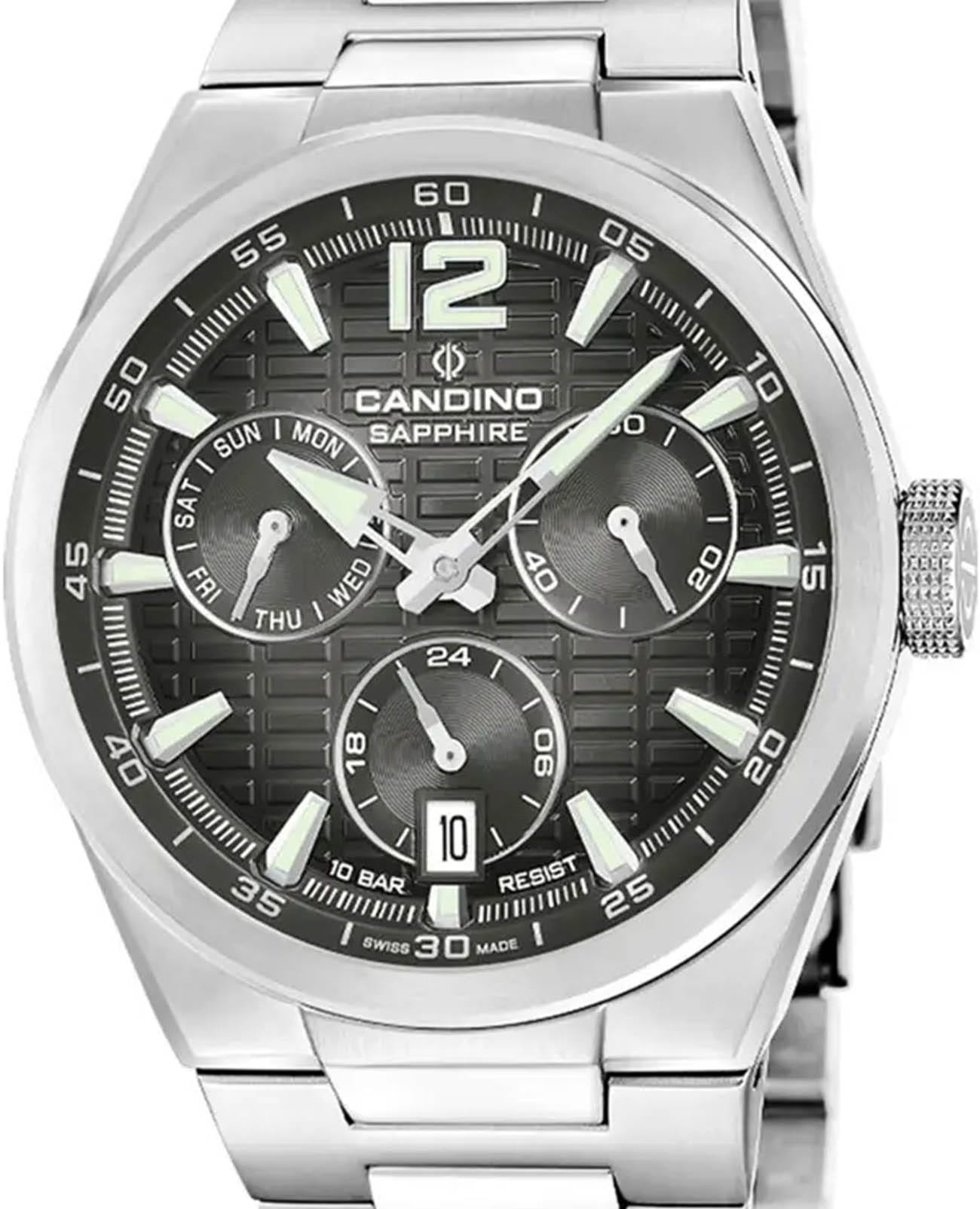 Мужские кварцевые часы Candino — это сочетание классического дизайна, надёжности и швейцарского качества. Корпус диаметром 43 мм и толщиной 11,5 мм выполнен из нержавеющей стали. Циферблат чёрного цвета оформлен индексами в виде штрихов и стрелками. Указатели дня недели и даты расположены в центре циферблата. Стрелки и метки с люминесцентным покрытиемЛюминесцентное покрытиеПозволяет считывать показания времени в темноте. Производители наносят на стрелки, часовые индексы, безель или поверхность циферблата светонакопительный состав, дающий холодное свечение., обеспечивающим хорошую читаемость в темноте. Циферблат защищён сапфировым стекломСапфировое стеклоПрочный и надёжный материал из кристалла сапфира синтетического происхождения, характеризующийся особой твёрдостью и устойчивостью к царапинам и повреждениям., устойчивым к царапинам. Механизм — кварцевый произведённый в Швейцарии. Часы оснащены стальным браслетом с раскладной застёжкойРаскладная застёжкаТакой тип застёжки используется только на браслетах из металла. Она никогда не раскрывается полностью, происходит разделение на 2 и более частей. Раскладывающая застёжка снизит вероятность потери часов к минимуму.. Водонепроницаемость 100 м позволяет использовать часы для плавания и повседневного ношения. Гарантия — 2 года. Идеальный выбор для тех, кто ценит стиль, функциональность и точность.