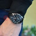 Чёрный циферблат с серебристыми элементами выполнен в спортивном стиле с уклоном в автомобильное оформление. Благодаря строгой цветовой палитре и классическому ремешку из натуральной кожи аксессуар подходит как к деловому костюму, так и к повседневной водолазке. Японский кварцевый калибр с точностью хода +/- 20 секунд в месяц. Срок эксплуатации батарейки - 3 года. Стрелки с люминесцентной подсветкойЛюминесцентное покрытиеПозволяет считывать показания времени в темноте. Производители наносят на стрелки, часовые индексы, безель или поверхность циферблата светонакопительный состав, дающий холодное свечение.. Ударопрочный корпусУдаропрочный корпусМеханизм заключён в корпус, выполненный из современных материалов, устойчивых к ударам, механическим повреждениям и падению с высоты: инновационный пластик, карбон, нержавеющая сталь, титан. из стали 316L. БезельБезельВнешний ободок, закрепляющий стекло. В спортивных часах так называется поворотное кольцо с делениями на циферблате, выполняет роль таймера – замеряет отрезки времени на шкале. Неподвижный безель – элемент декора. Однонаправленно вращающийся безель на дайверских часах позволяет фиксировать моменты погружения и выныривания на поверхность. с чёрным IP-покрытиемIP-покрытиеМетод ионного напыления. Демонстрирует повышенную устойчивость к истиранию, окислению и химическим веществам. Под воздействием высокого давления и температуры около 1500°C молекулы металла надёжно соединяются с частицами корпуса часов.. Минеральное стекло. Секундомер, хронографХронографФункция позволяет измерять отрезки времени с особой точностью: часы, минуты, секунды. Верным признаком хронографа является наличие на циферблате 3 дополнительных окошек-счётчиков., календарь. Габариты: 48,5 x 43,8 x 12,1 мм.