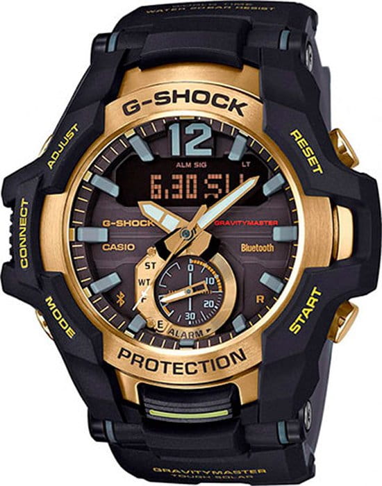Наручные часы являются представителем линейки Gravitymaster, дисплей чем-то напоминает кабину пассажирского самолёта. Особенностью аксессуара стал цифровой дисплей с самым высоким разрешением среди G-Shock, что появилось за счёт внедрения технологии STN. Это позволило добиться широкоугольного обзора и улучшить читаемость циферблата. Также интерес привлекает модифицированный таймер, где можно установить число, месяц или год, планируемому событию для удобства можно дать название. Противоударный корпусУдаропрочный корпусМеханизм заключён в корпус, выполненный из современных материалов, устойчивых к ударам, механическим повреждениям и падению с высоты: инновационный пластик, карбон, нержавеющая сталь, титан. выполнен из полимерного материала, японский кварцевый механизм с точностью хода +/- 15 секунд в месяц находится под надёжной защитой. безельБезельВнешний ободок, закрепляющий стекло. В спортивных часах так называется поворотное кольцо с делениями на циферблате, выполняет роль таймера – замеряет отрезки времени на шкале. Неподвижный безель – элемент декора. Однонаправленно вращающийся безель на дайверских часах позволяет фиксировать моменты погружения и выныривания на поверхность. из стали 316L c золотистым IP-покрытиемIP-покрытиеМетод ионного напыления. Демонстрирует повышенную устойчивость к истиранию, окислению и химическим веществам. Под воздействием высокого давления и температуры около 1500°C молекулы металла надёжно соединяются с частицами корпуса часов.. Технология . Индикатор заряда аккумулятора. Закаленное минеральное стекло. Синхронизация со смартфоном Bluetooth 4.0BluetoothСовременная технология, позволяющая синхронизировать часы с телефоном и переносить данные. Часы с Bluetooth расширяют возможности вашего смартфона и делают его использование ещё более удобным.. Водозащита 20 бар. СветодиоднаяСветодиодная подсветкаСветодиодная или LED-подсветка обеспечивает появление яркого холодного свечения за счёт LED-элементов - маленьких лампочек. Они потребляют минимальное количество энергии, чаще всего можно встретить 1 светодиод, в нижней части циферблата. и люминесцентнаяЛюминесцентное покрытиеПозволяет считывать показания времени в темноте. Производители наносят на стрелки, часовые индексы, безель или поверхность циферблата светонакопительный состав, дающий холодное свечение. подсветка. Возможности: поиск телефона, секундомер, будильник, хронографХронографФункция позволяет измерять отрезки времени с особой точностью: часы, минуты, секунды. Верным признаком хронографа является наличие на циферблате 3 дополнительных окошек-счётчиков., автоматический календарь до 2099 года, мировое времяМировое время Полезное часовое усложнение, отображающее время в основных городах и известных областях по всему миру, оно связано с часовыми поясами, удобно для путешественников и бизнесменов. , UTCUTCВсемирное кординационное время, не имеющее привязки к географическому положению Гринвича, основывается на атомном отсчёте времени. Регулировка времени осуществляется более точно, чем устаревшее GMT.