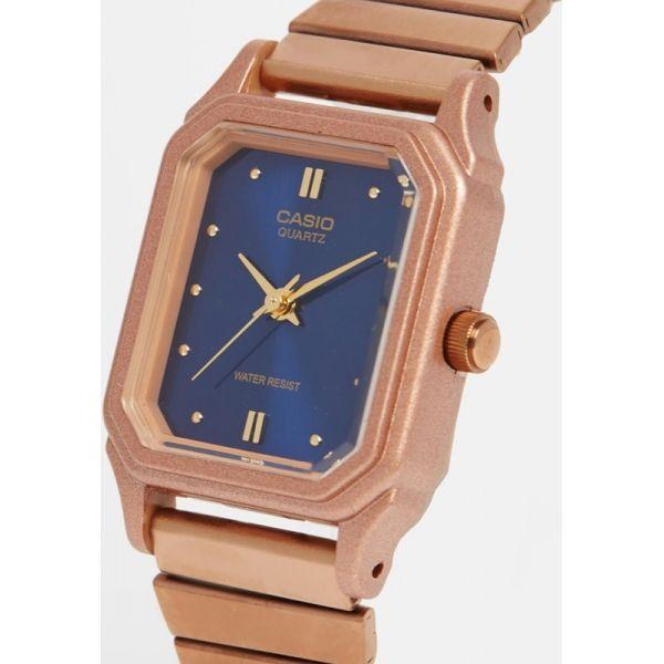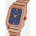 Стильные женские наручные часы в прямоугольном корпусе. Корпус - Пластиковый; Стекло - Пластик; Водозащита - 30 м. (WR 30); Материал ремешка - Нержавеющая сталь, PVD покрытие; Цвет ремешка - Коричневый; Цвет циферблата - Синий.