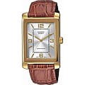 Строгие мужские часы в прямоугольном корпусе. Корпус - Латунь; Стекло - Минеральное; Водозащита - 30 м. (WR 30); Материал ремешка - Кожаный; Цвет ремешка - Коричневый; Цвет циферблата - Серебряный.