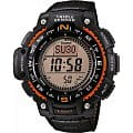 Многофункциональные японские мужские наручные часы. Мировое время: 31 временная зона, 48 городов. Время восхода и заката. Секундомер. Полный автоматический календарь (до 2099 года). 12/24-часовой формат. Автоматическая светодиодная подсветка. Цифровой компас с графическим указателем направления. Барометр с диапазоном измерения от 260 до 1100 hPa (от 7,65 до 32.45 inHg). Построение графика изменения атмосферного давления за последние 42 часа измерения. Термометр с диапазоном измерения от -10 до 60 C  Корпус - Пластиковый; Стекло - Пластик; Водозащита - 100 м. (WR 100); Материал ремешка - Тканевый; Цвет ремешка - Черный; Цвет циферблата - Lcd.
