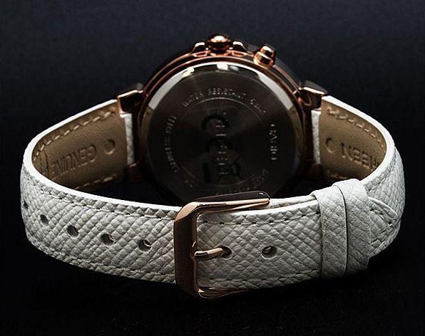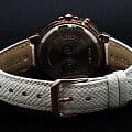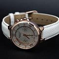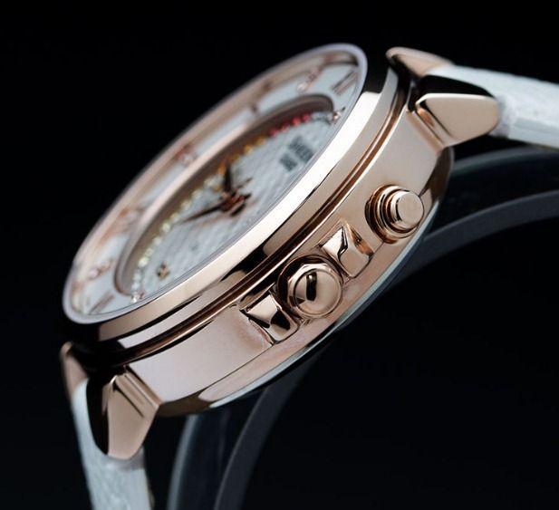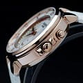 Изящные женские наручные часы, выполненные в fashion стиле. Кварцевые часы с элементом питания SR920SW. Корпус часов выполнен из высокопрочной стали с полным PVD покрытием. Циферблат украшен цветными кристаллами Swarovski. Водонепроницаемость часов 50 метров, минеральное стекло, устойчивое к царапинам. Часы удерживаются на руке белым ремешком из натуральной кожи. Очень женственная и нежная модель часов.