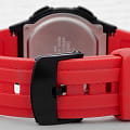 Спортивные мужские наручные часы. Автоматический календарь. 12и 24-часовой формат времени. Секундомер. Отображение времени в двух часовых поясах. Корпус - Пластиковый; Стекло - Пластик; Водозащита - 50 м. (WR 50); Материал ремешка - Пластиковый; Цвет ремешка - Красный; Цвет циферблата - Lcd.