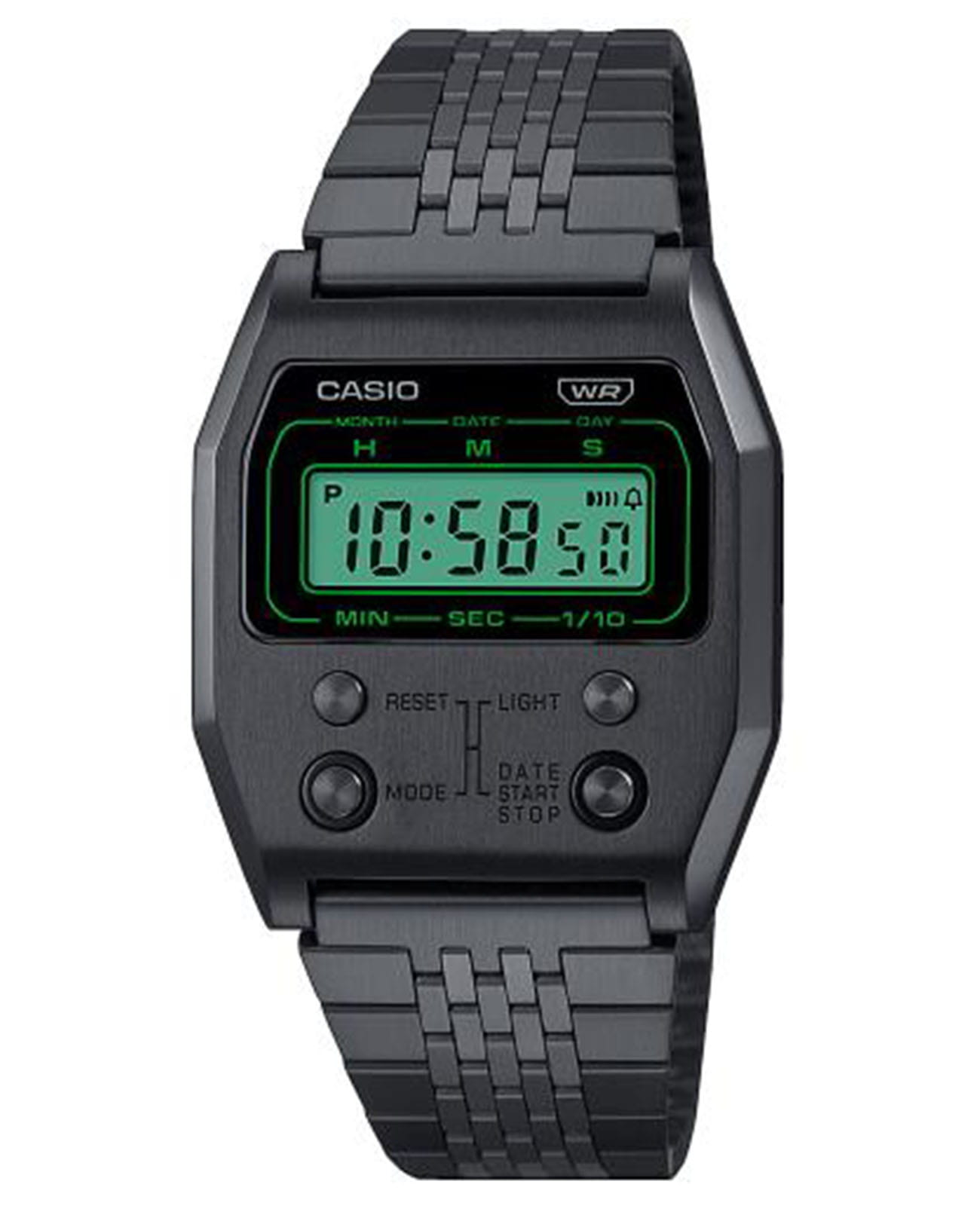 Спортивные японские мужские часы с секундомеромСекундомерСекундоме́р — прибор, способный измерять интервалы времени с точностью до долей секунды. Casio Vintage A1100B-1, кварцевый механизм с высокой точностью. Издавая звуковой сигнал в установленное время, будильникБудильникБуди́льник — часы, в заданный момент времени подающие звуковой, световой и/или в редких случаях другой сигнал. напоминает о событиях, которые повторяются каждый день. Корпус и браслет часов изготовлены из нержавеющей стали с IP-покрытиемIP-покрытиеМетод ионного напыления. Демонстрирует повышенную устойчивость к истиранию, окислению и химическим веществам. Под воздействием высокого давления и температуры около 1500°C молекулы металла надёжно соединяются с частицами корпуса часов.. Класс водозащиты: 30 метров, позволит защитить корпус от случайных брызг или капель дождя. Стальной браслет на раскладной застёжкеРаскладная застёжкаТакой тип застёжки используется только на браслетах из металла. Она никогда не раскрывается полностью, происходит разделение на 2 и более частей. Раскладывающая застёжка снизит вероятность потери часов к минимуму..