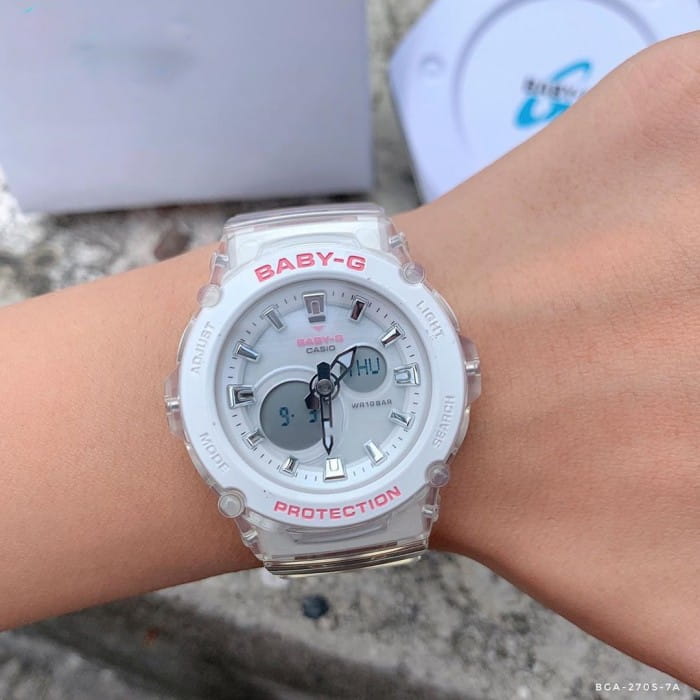 Женские японские наручные часы с противоударным корпусом Casio Baby-G BGA-270S-7A, кварцевый механизм с высокой точностью. Класс водозащиты: 100 метров, позволит плавать, нырять и заниматься другими водными видами спорта. Корпус часов изготовлен из пластика, цвета.