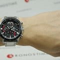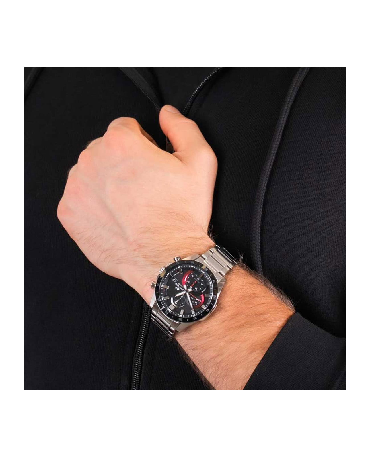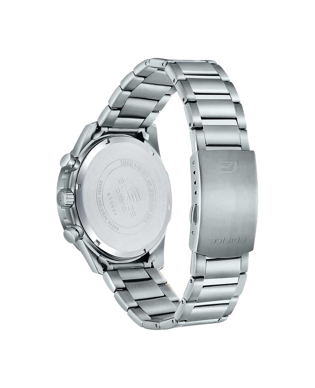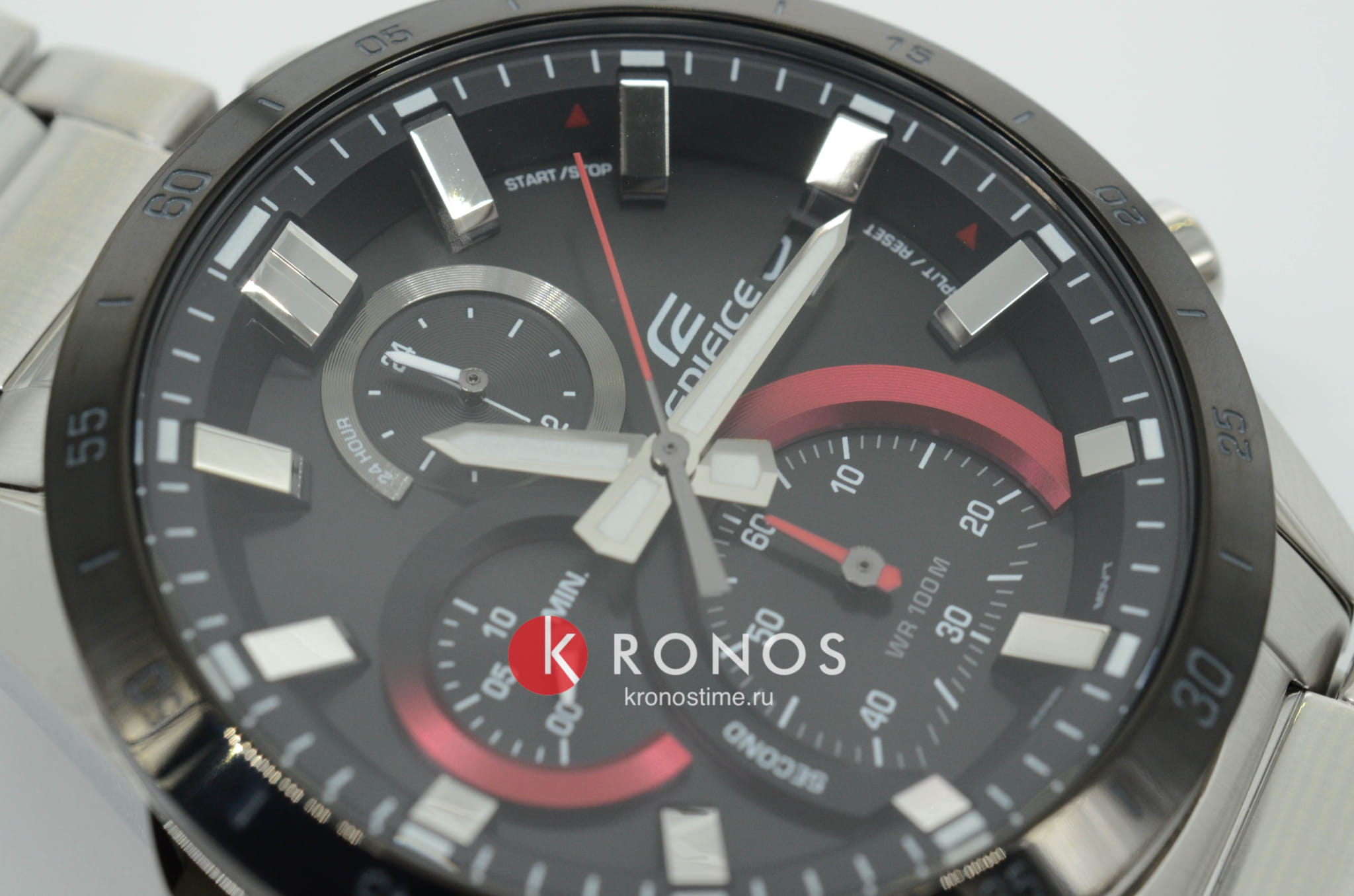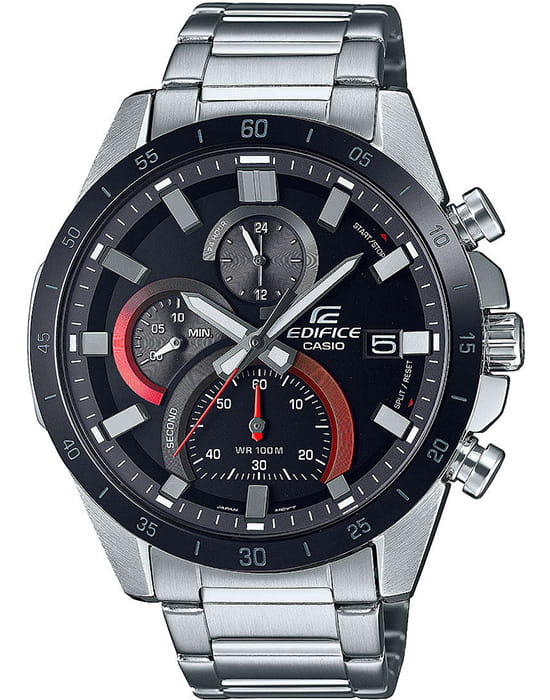 Мужские часы-хронографХронографФункция позволяет измерять отрезки времени с особой точностью: часы, минуты, секунды. Верным признаком хронографа является наличие на циферблате 3 дополнительных окошек-счётчиков. Casio Edifice EFR-571DB-1A1, кварцевый механизм с высокой точностью. Минеральное стеклоМинеральное стеклоМинеральное стекло представляет собой искусственно выращенный минерал кварца. Такое стекло отличается особой устойчивостью к повреждениям и царапинам. Уступает по некоторым качествам сапфировому стеклу. устойчивое к появлению царапин, обладающее высокой прозрачностью. СекундомерСекундомерСекундоме́р — прибор, способный измерять интервалы времени с точностью до долей секунды. с точностью показаний 1/10с и временем измерения 1ч. Корпус изготовлен из нержавеющей стали. Стрелки и метки с люминесцентным покрытиемЛюминесцентное покрытиеПозволяет считывать показания времени в темноте. Производители наносят на стрелки, часовые индексы, безель или поверхность циферблата светонакопительный состав, дающий холодное свечение.. На циферблате находится три дополнительных индикатора. Окошко даты находится в положении 3 часов. Класс водозащиты: 100 метров, позволит плавать, нырять и заниматься другими водными видами спорта. Заводная головка с защитой. Стальной браслет на раскладной застёжкеРаскладная застёжкаТакой тип застёжки используется только на браслетах из металла. Она никогда не раскрывается полностью, происходит разделение на 2 и более частей. Раскладывающая застёжка снизит вероятность потери часов к минимуму..