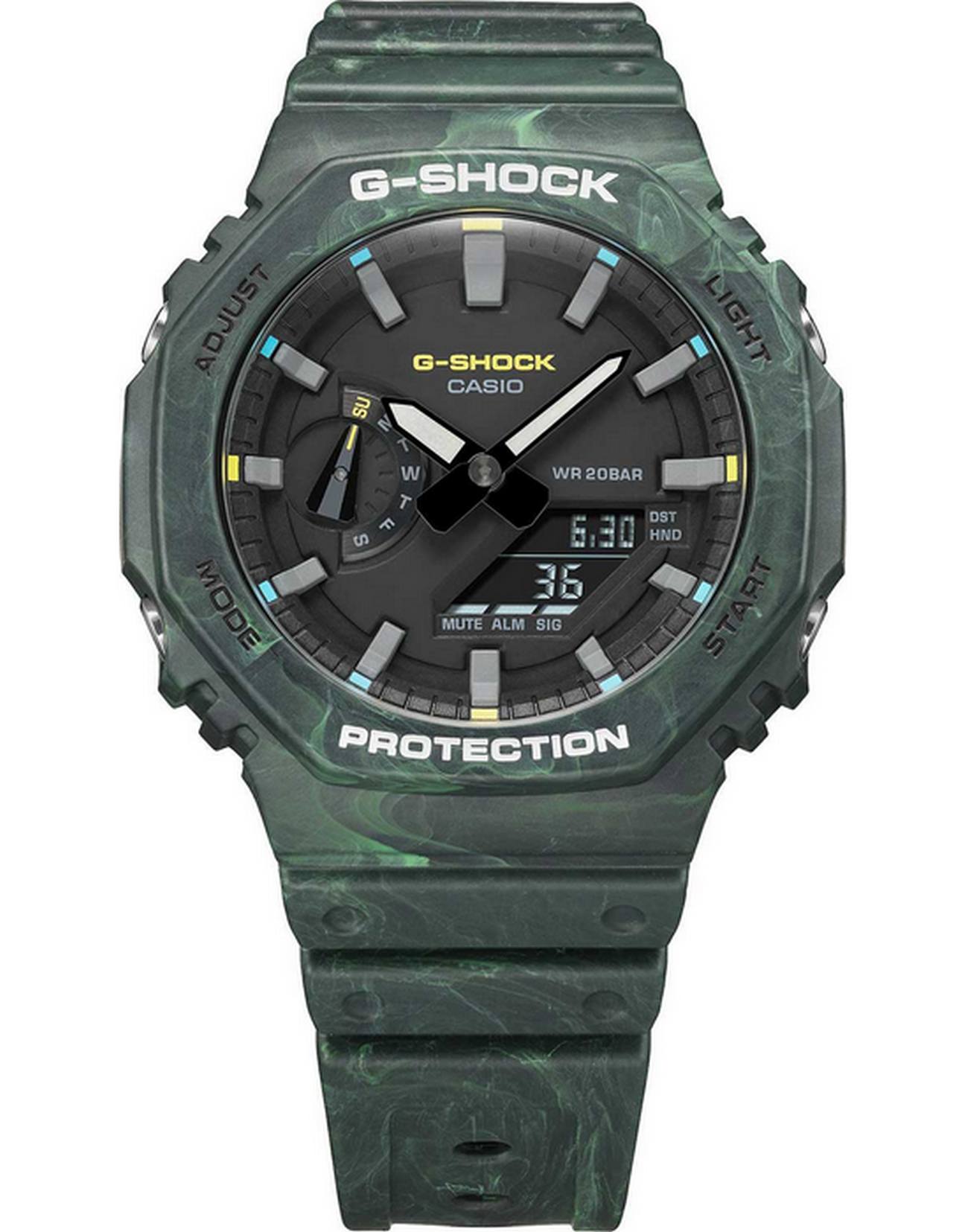 Японские наручные мужские часы Casio G-SHOCK GA-2100FR-3AER с хронографом Casio G-Shock GA-2100FR-3A, электронный механизм с высокой точностью. Класс водозащиты: 200 метров, позволит плавать, нырять и заниматься другими водными видами спорта. Корпус часов изготовлен из пластика, цвета.