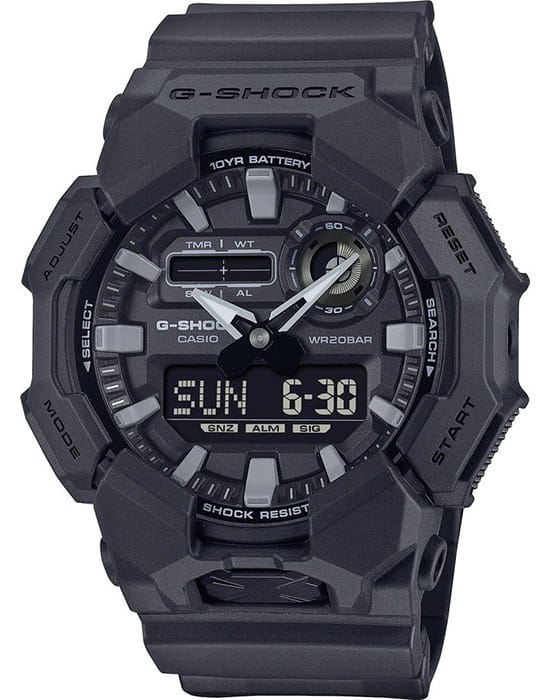 Японские мужские многофункциональные часы Casio GA-010-1A1. Функции: автоматическая светодиодная подсветка, ударопрочный корпусУдаропрочный корпусМеханизм заключён в корпус, выполненный из современных материалов, устойчивых к ударам, механическим повреждениям и падению с высоты: инновационный пластик, карбон, нержавеющая сталь, титан., функция Мирового времениМировое время Полезное часовое усложнение, отображающее время в основных городах и известных областях по всему миру, оно связано с часовыми поясами, удобно для путешественников и бизнесменов. , секундомерСекундомерСекундоме́р — прибор, способный измерять интервалы времени с точностью до долей секунды., таймерТаймерОтсчитывает секунды в обратном направлении в заданном интервале времени., 5 будильниковБудильникБуди́льник — часы, в заданный момент времени подающие звуковой, световой и/или в редких случаях другой сигнал., автоматический календарь, 12/24 отображение времени. Минеральное стеклоМинеральное стеклоМинеральное стекло представляет собой искусственно выращенный минерал кварца. Такое стекло отличается особой устойчивостью к повреждениям и царапинам. Уступает по некоторым качествам сапфировому стеклу. устойчивое к появлению царапин, обладающее высокой прозрачностью. Класс водозащиты: 200 метров, позволит плавать, нырять и заниматься другими водными видами спорта. Срок жизни батареи 10 лет. Ремешок из полимерного пластика на стандартной застежке обеспечивает комфорт в использовании часов и надежную фиксацию.