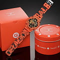 Ярко-оранжевый ударопрочный корпусУдаропрочный корпусМеханизм заключён в корпус, выполненный из современных материалов, устойчивых к ударам, механическим повреждениям и падению с высоты: инновационный пластик, карбон, нержавеющая сталь, титан. с узором выполнен из пластика и стали 316L. Японский кварцевый калибр отличается высокой точностью хода. Часы устойчивы к вредному воздействию магнитного поля. Прочное минеральное стекло защищает циферблат от повреждений. Сохраняется водостойкость до 20 бар. Функции: светодиодная подсветкаСветодиодная подсветкаСветодиодная или LED-подсветка обеспечивает появление яркого холодного свечения за счёт LED-элементов - маленьких лампочек. Они потребляют минимальное количество энергии, чаще всего можно встретить 1 светодиод, в нижней части циферблата., таймер, расчёт средней скорости пути, секундомер, мировое времяМировое время Полезное часовое усложнение, отображающее время в основных городах и известных областях по всему миру, оно связано с часовыми поясами, удобно для путешественников и бизнесменов. , календарь.