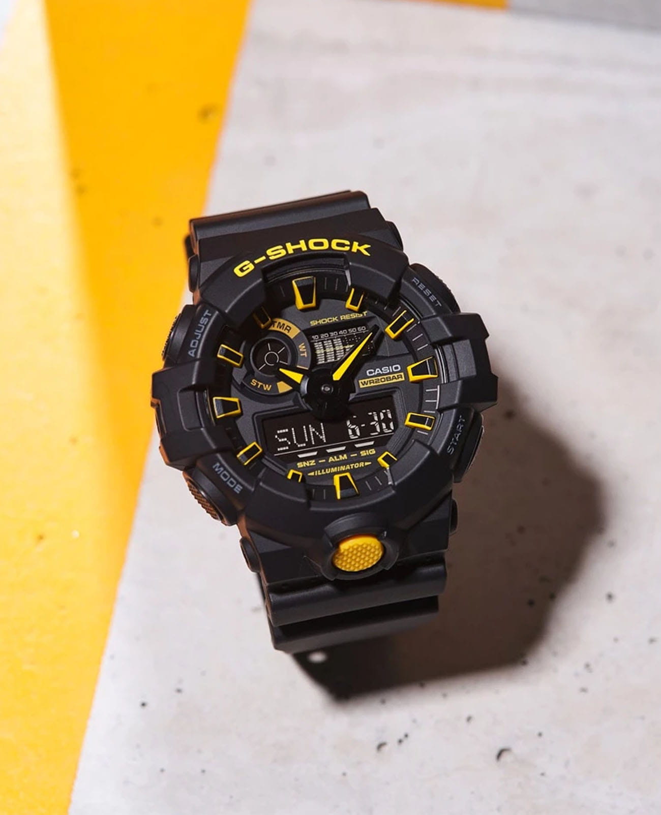 Японские мужские часы-хронографХронографФункция позволяет измерять отрезки времени с особой точностью: часы, минуты, секунды. Верным признаком хронографа является наличие на циферблате 3 дополнительных окошек-счётчиков. Casio G-Shock GA-700CY-1A. Эти прочные часы, выполненные в яркой черно-желтой цветовой гамме, завораживают глаз и привлекают к себе внимание. Строгий, но стильный дизайн выполнен в базовом черном цвете с акцентом на оттенках ярко-желтого, который используется для аварийно-спасательных работ и знаков безопасности. Стильный универсальный образ, который дополняет как повседневный, так и рабочий стили. Минеральное стеклоМинеральное стеклоМинеральное стекло представляет собой искусственно выращенный минерал кварца. Такое стекло отличается особой устойчивостью к повреждениям и царапинам. Уступает по некоторым качествам сапфировому стеклу. устойчивое к появлению царапин, обладающее высокой прозрачностью. Tough SolarTough SolarТехнология основана на подзарядке аккумулятора от источника солнечного света, специальная панель улавливает солнечные лучи и преобразует их в энергию для работы часов. Достаточно пары минут нахождения на солнце для функционирования часов в течении суток..  Ударопрочный корпусУдаропрочный корпусМеханизм заключён в корпус, выполненный из современных материалов, устойчивых к ударам, механическим повреждениям и падению с высоты: инновационный пластик, карбон, нержавеющая сталь, титан. защищает механизм от ударов и вибрации. Светодиодная подсветкаСветодиодная подсветкаСветодиодная или LED-подсветка обеспечивает появление яркого холодного свечения за счёт LED-элементов - маленьких лампочек. Они потребляют минимальное количество энергии, чаще всего можно встретить 1 светодиод, в нижней части циферблата. освещает весь циферблат, после отпускания кнопки свечение продолжается еще некоторое время. Настраиваемое послесвечение 1,5 или 3сек. Мировое время Мировое время Полезное часовое усложнение, отображающее время в основных городах и известных областях по всему миру, оно связано с часовыми поясами, удобно для путешественников и бизнесменов. 48 городов (29 часовых поясов), всемирное координированное время UTCUTCВсемирное кординационное время, не имеющее привязки к географическому положению Гринвича, основывается на атомном отсчёте времени. Регулировка времени осуществляется более точно, чем устаревшее GMT.