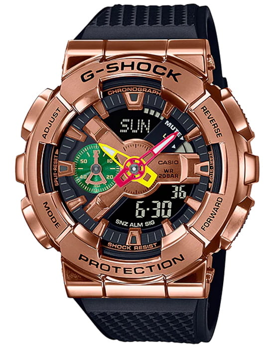 Корпус часов бронзового цвета изготовлен из нержавеющей стали с внутренним корпусом из полимерного пластика. Часы ударопрочные с водозащитой до 200 метров. Светодиодная подсветка Super Illuminator с автоматическим переключением света, возможностью выбрать продолжительность освещения (1,5 секунды или 3 секунды), послесвечение. Ремешок из полимерного материала с классической застежкой.