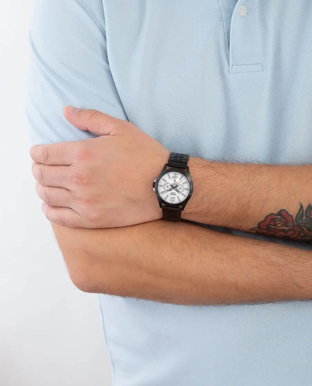 Японские мужские часы с минеральным стекломМинеральное стеклоМинеральное стекло представляет собой искусственно выращенный минерал кварца. Такое стекло отличается особой устойчивостью к повреждениям и царапинам. Уступает по некоторым качествам сапфировому стеклу. Casio Collection MTP-E350B-7B, кварцевый механизм с высокой точностью. Корпус часов изготовлен из стали с IP-покрытиемIP-покрытиеМетод ионного напыления. Демонстрирует повышенную устойчивость к истиранию, окислению и химическим веществам. Под воздействием высокого давления и температуры около 1500°C молекулы металла надёжно соединяются с частицами корпуса часов.. Стрелки и метки с люминесцентным покрытиемЛюминесцентное покрытиеПозволяет считывать показания времени в темноте. Производители наносят на стрелки, часовые индексы, безель или поверхность циферблата светонакопительный состав, дающий холодное свечение.. 12-ти и 24-х часовой формат времени, число и день недели вынесены на отдельные циферблаты. Заводная головка с защитой. Батарея рассчитана на 3 года. Класс водозащиты: 50 метров, позволит защитить корпус от случайных брызг или капель дождя. Стальной браслет с IP-покрытиемIP-покрытиеМетод ионного напыления. Демонстрирует повышенную устойчивость к истиранию, окислению и химическим веществам. Под воздействием высокого давления и температуры около 1500°C молекулы металла надёжно соединяются с частицами корпуса часов. на раскладной застёжкеРаскладная застёжкаТакой тип застёжки используется только на браслетах из металла. Она никогда не раскрывается полностью, происходит разделение на 2 и более частей. Раскладывающая застёжка снизит вероятность потери часов к минимуму..