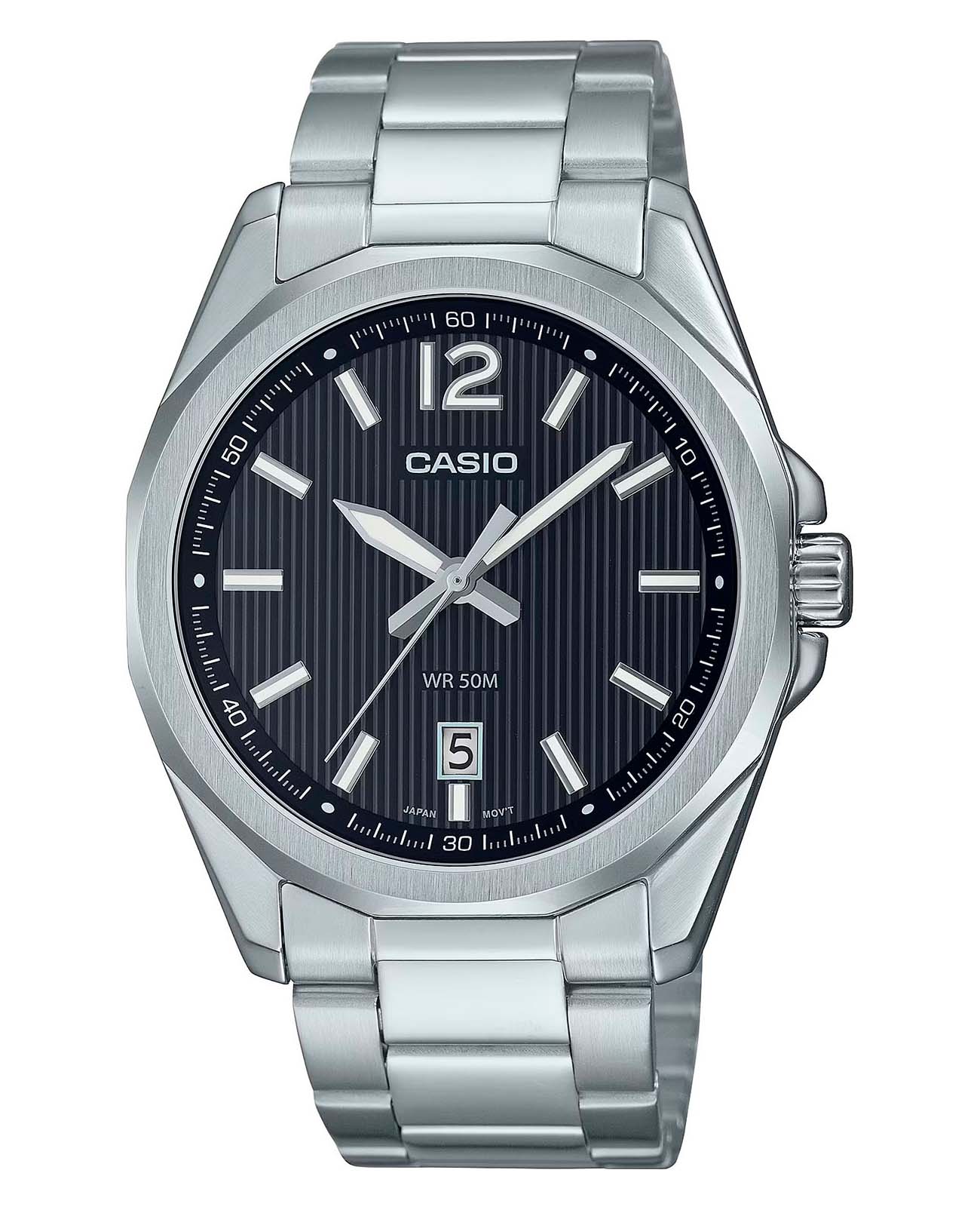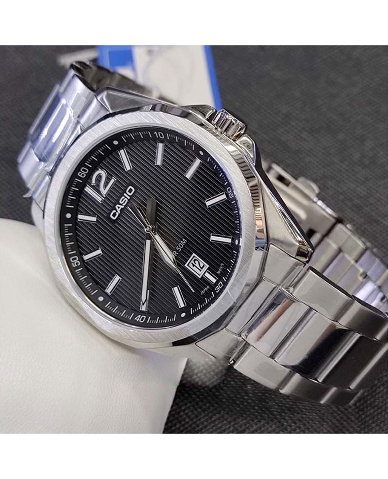 Японские мужские часы с минеральным стекломМинеральное стеклоМинеральное стекло представляет собой искусственно выращенный минерал кварца. Такое стекло отличается особой устойчивостью к повреждениям и царапинам. Уступает по некоторым качествам сапфировому стеклу. Casio Collection MTP-E725D-1A, кварцевый механизм с высокой точностью. Корпус часов изготовлен из стали. Стрелки и метки с люминесцентным покрытиемЛюминесцентное покрытиеПозволяет считывать показания времени в темноте. Производители наносят на стрелки, часовые индексы, безель или поверхность циферблата светонакопительный состав, дающий холодное свечение.. Метки в виде штрихов. Окошко даты находится в положении 6 часов. Заводная головка с защитой. Класс водозащиты: 50 метров, позволит защитить корпус от случайных брызг или капель дождя. Стальной браслет на раскладной застёжкеРаскладная застёжкаТакой тип застёжки используется только на браслетах из металла. Она никогда не раскрывается полностью, происходит разделение на 2 и более частей. Раскладывающая застёжка снизит вероятность потери часов к минимуму..