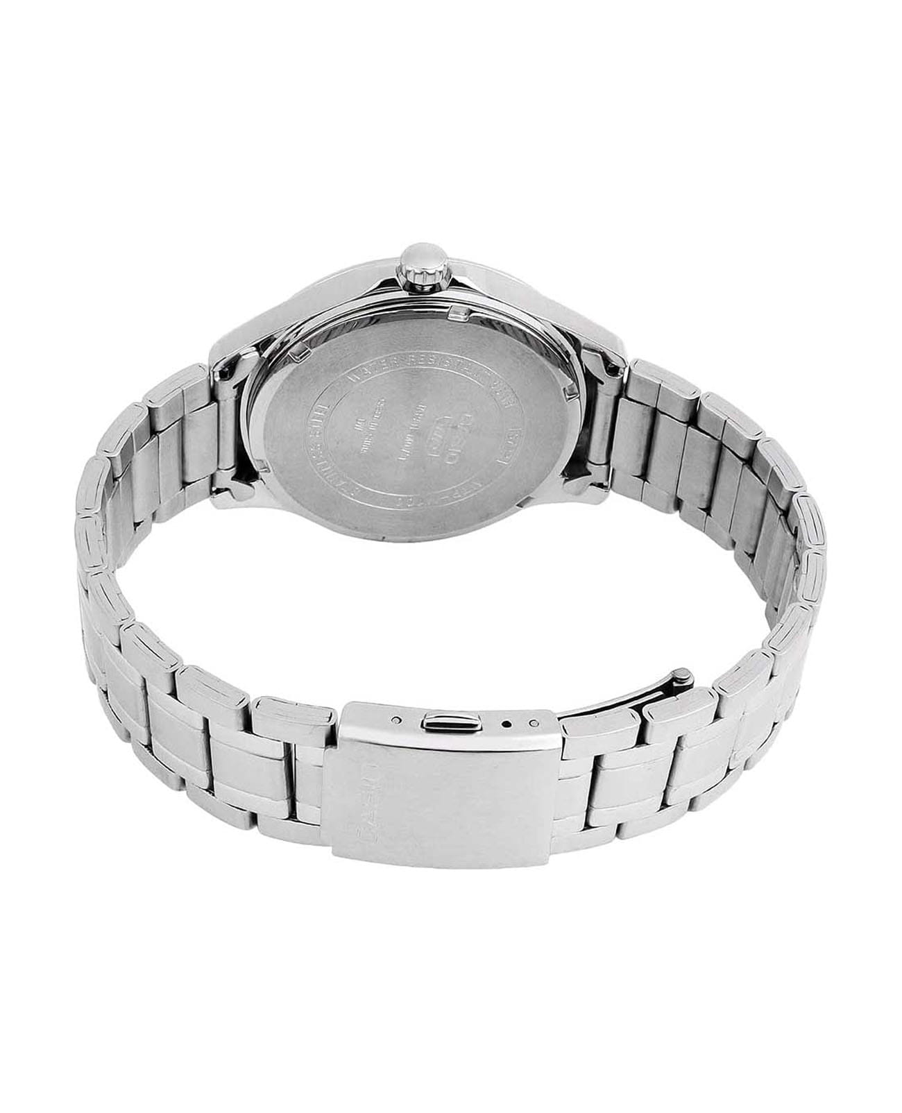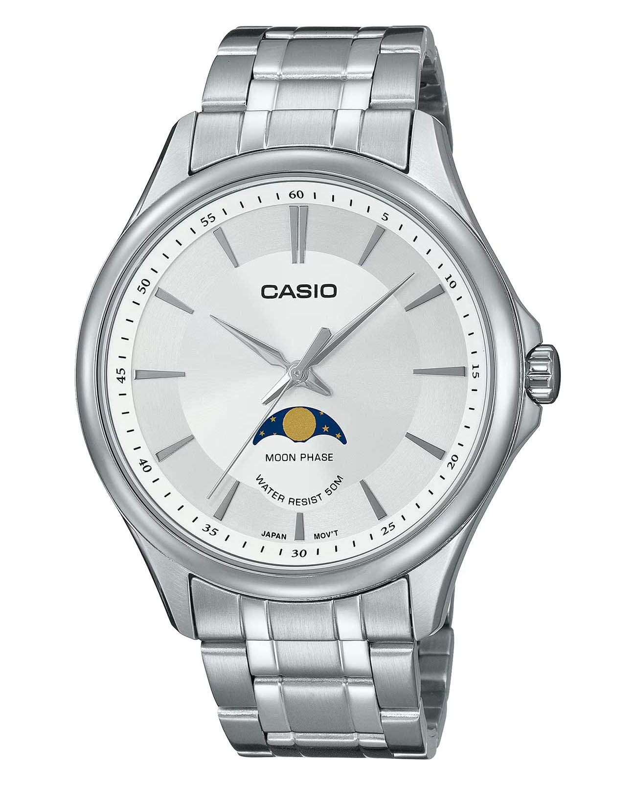 Японские мужские часы с минеральным стекломМинеральное стеклоМинеральное стекло представляет собой искусственно выращенный минерал кварца. Такое стекло отличается особой устойчивостью к повреждениям и царапинам. Уступает по некоторым качествам сапфировому стеклу. Casio Collection MTP-M100D-7A, кварцевый механизм с высокой точностью. Корпус часов изготовлен из стали с IP-покрытиемIP-покрытиеМетод ионного напыления. Демонстрирует повышенную устойчивость к истиранию, окислению и химическим веществам. Под воздействием высокого давления и температуры около 1500°C молекулы металла надёжно соединяются с частицами корпуса часов.. Циферблат с метками в виде штрихов выполнен по технологии Sunray (солнечные лучи). Отображение фаз Луны. Заводная головка с защитой. Батарейка рассчитана на 3 года. Задняя крышка с винтовым фиксатором. Класс водозащиты: 50 метров, позволит защитить корпус от случайных брызг или капель дождя. Стальной браслет с IP-покрытиемIP-покрытиеМетод ионного напыления. Демонстрирует повышенную устойчивость к истиранию, окислению и химическим веществам. Под воздействием высокого давления и температуры около 1500°C молекулы металла надёжно соединяются с частицами корпуса часов. на раскладной застёжкеРаскладная застёжкаТакой тип застёжки используется только на браслетах из металла. Она никогда не раскрывается полностью, происходит разделение на 2 и более частей. Раскладывающая застёжка снизит вероятность потери часов к минимуму..
