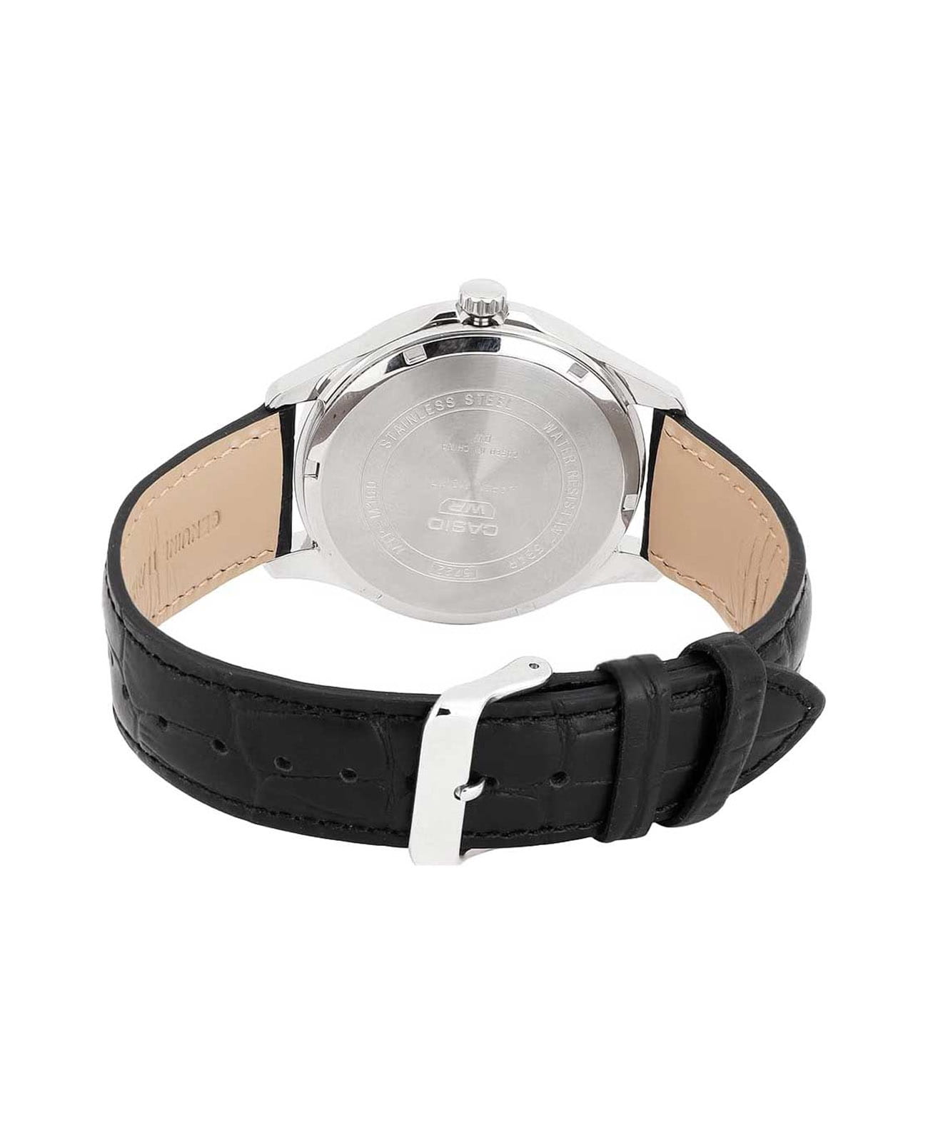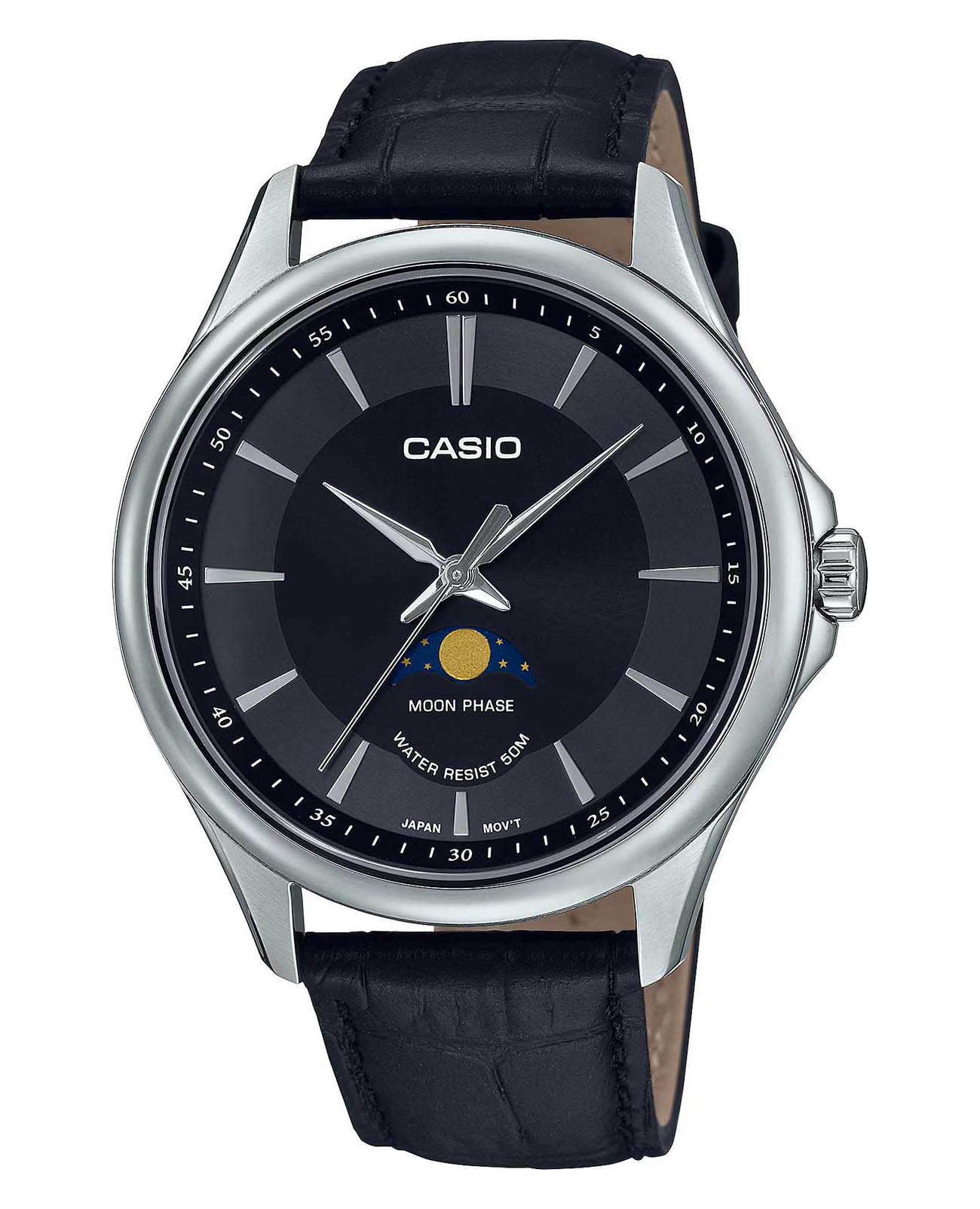 Японские мужские часы с минеральным стекломМинеральное стеклоМинеральное стекло представляет собой искусственно выращенный минерал кварца. Такое стекло отличается особой устойчивостью к повреждениям и царапинам. Уступает по некоторым качествам сапфировому стеклу. Casio Collection MTP-M100L-1A, кварцевый механизм с высокой точностью. Корпус часов изготовлен из стали с IP-покрытиемIP-покрытиеМетод ионного напыления. Демонстрирует повышенную устойчивость к истиранию, окислению и химическим веществам. Под воздействием высокого давления и температуры около 1500°C молекулы металла надёжно соединяются с частицами корпуса часов.. Циферблат с метками в виде штрихов выполнен по технологии Sunray (солнечные лучи). Отображение фаз Луны. Заводная головка с защитой. Батарейка рассчитана на 3 года. Задняя крышка с винтовым фиксатором. Класс водозащиты: 50 метров, позволит защитить корпус от случайных брызг или капель дождя. Кожаный ремешок на стандартной застёжке.