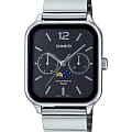 Японские мужские кварцевые часы с минеральным стекломМинеральное стеклоМинеральное стекло представляет собой искусственно выращенный минерал кварца. Такое стекло отличается особой устойчивостью к повреждениям и царапинам. Уступает по некоторым качествам сапфировому стеклу. Casio Collection MTP-M305D-1A, кварцевый механизм с высокой точностью. Корпус часов изготовлен из нержавеющей стали. Циферблат с метками в виде штрихов. Особенностью модели является наличие индикатора фазы луны над шестью часами по циферблату. Индикатор имеет 4 положения и отображается новолуние и полнолуние, а также растущую и убывающую Луну. Батарейка рассчитана на 3 года. Класс водозащиты: 50 метров, позволит защитить корпус от случайных брызг или капель дождя. Стальной браслет на раскладной застёжкеРаскладная застёжкаТакой тип застёжки используется только на браслетах из металла. Она никогда не раскрывается полностью, происходит разделение на 2 и более частей. Раскладывающая застёжка снизит вероятность потери часов к минимуму..