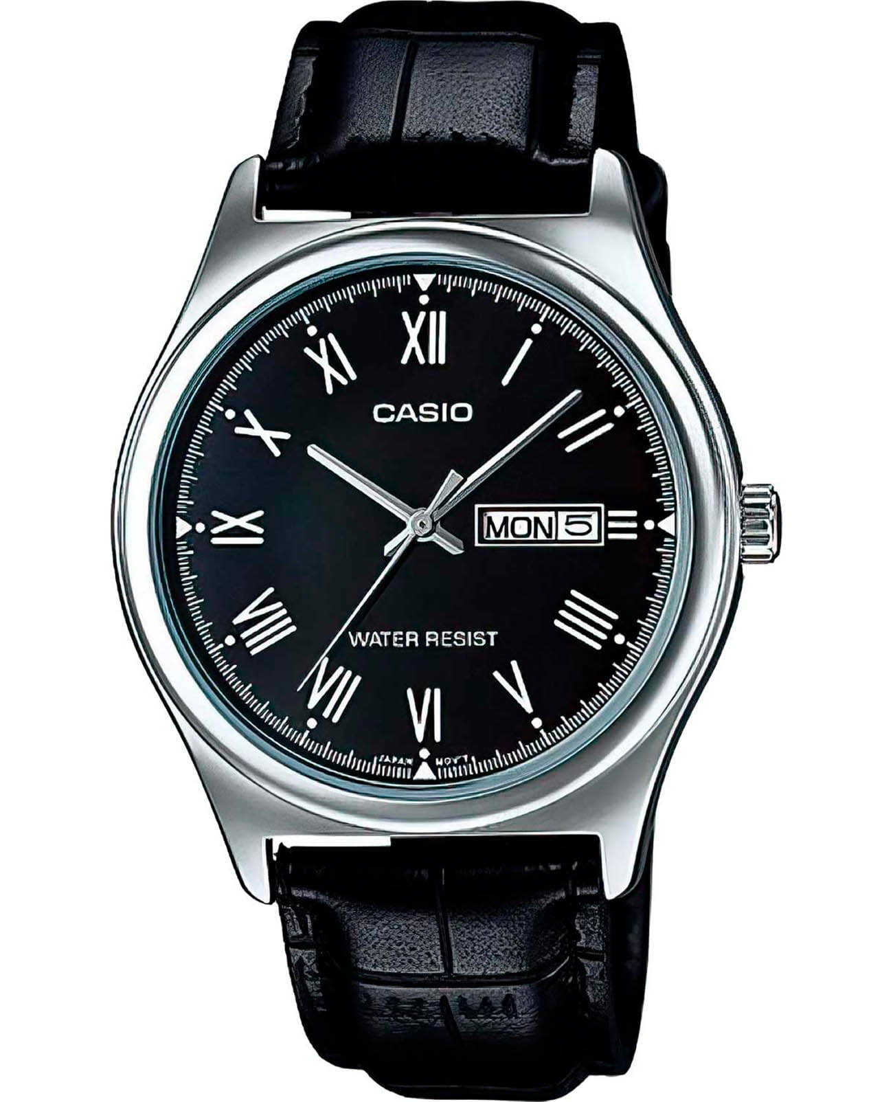 Мужские кварцевые часы Casio Collection — это классический аксессуар, созданный по строгим предписаниям формального дресс-кода. Корпус размером 38 мм и толщиной 9,4 мм выполнен из нержавеющей стали. Циферблат чёрного цвета оформлен штрихами, стрелками и двумя вынесенными окошками: для отображения дня недели и даты. Циферблат защищён минеральным стекломМинеральное стеклоМинеральное стекло представляет собой искусственно выращенный минерал кварца. Такое стекло отличается особой устойчивостью к повреждениям и царапинам. Уступает по некоторым качествам сапфировому стеклу.. Часы оснащены кожаным ремешком на классической пряжке. Водонепроницаемость 30 м позволяет использовать часы в повседневных условиях. Идеальный выбор для тех, кто ценит японское качество и универсальный дизайн.