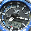 -навигация. Японский кварцевый механизм получает питание от батарейки, рассчитанной на 2-летний срок службы. Устойчивость к температуре ниже -10°C. Степень водостойкости WR 200. Ударопрочный корпусУдаропрочный корпусМеханизм заключён в корпус, выполненный из современных материалов, устойчивых к ударам, механическим повреждениям и падению с высоты: инновационный пластик, карбон, нержавеющая сталь, титан.. Минеральное стекло. Электролюминесцентная подсветкаЭлектролюминесцентная подсветкаЭлектролюминесцентная панель устанавливается под ЖК-экраном часов, при нажатии кнопки электричество преобразуется в свет за счёт подачи напряжения на атомы фосфора, такой тип подсветки позволяет освещать весь циферблат.. Полимерный ремешок с 3D-текстурой и системой быстрой замены браслета. Габариты: 57,5 x 50,8 x 16,8 мм.